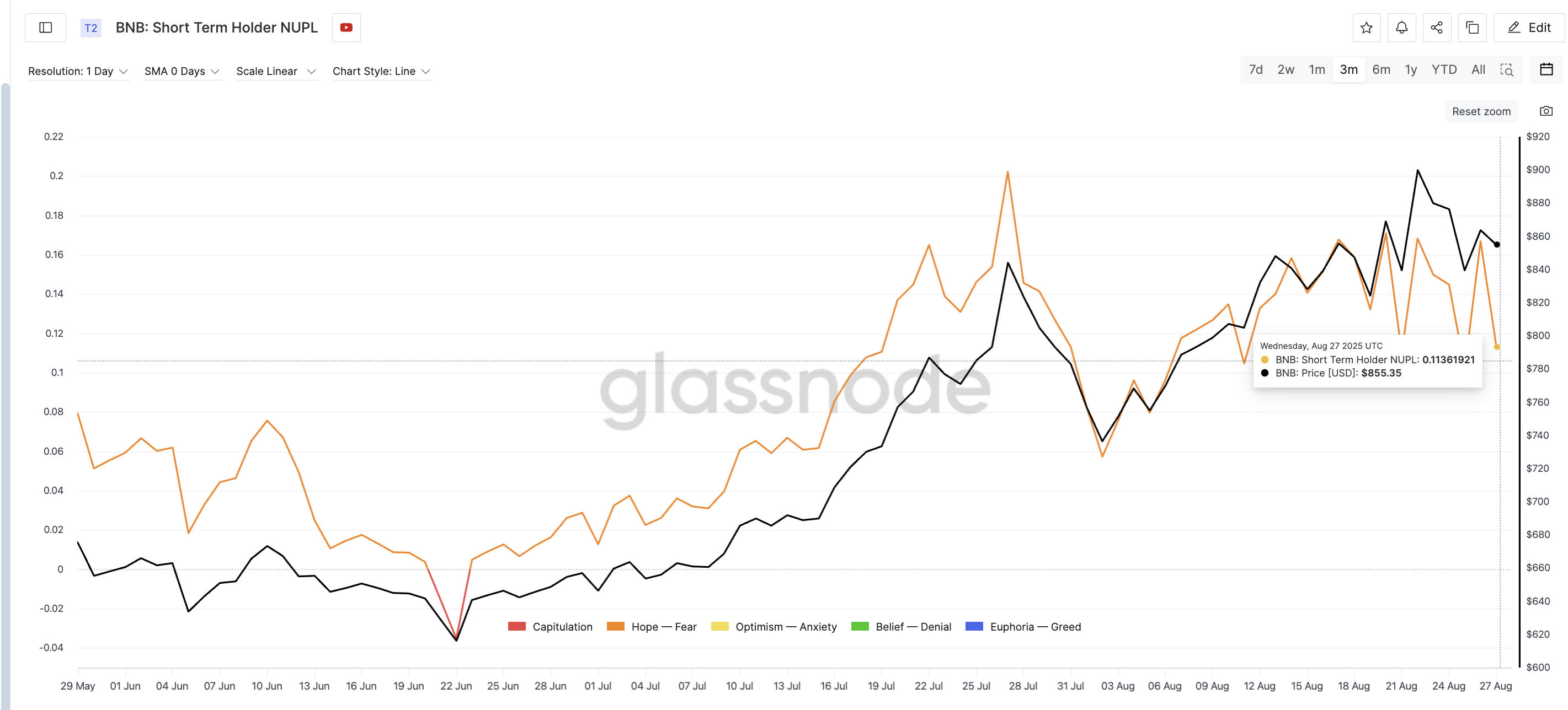 22 тамызда, BNB бағасы 899 долларға жеткен кезде, қысқа мерзімді NUPL 0,16 деңгейінде тұрды, яғни көпшілігі әлі де пайдада болды. 27 тамызға қарай ол күрт 0,11-ге дейін төмендеді, баға тек шамамен 5%-ға 855 долларға дейін төмендегеніне қарамастан.