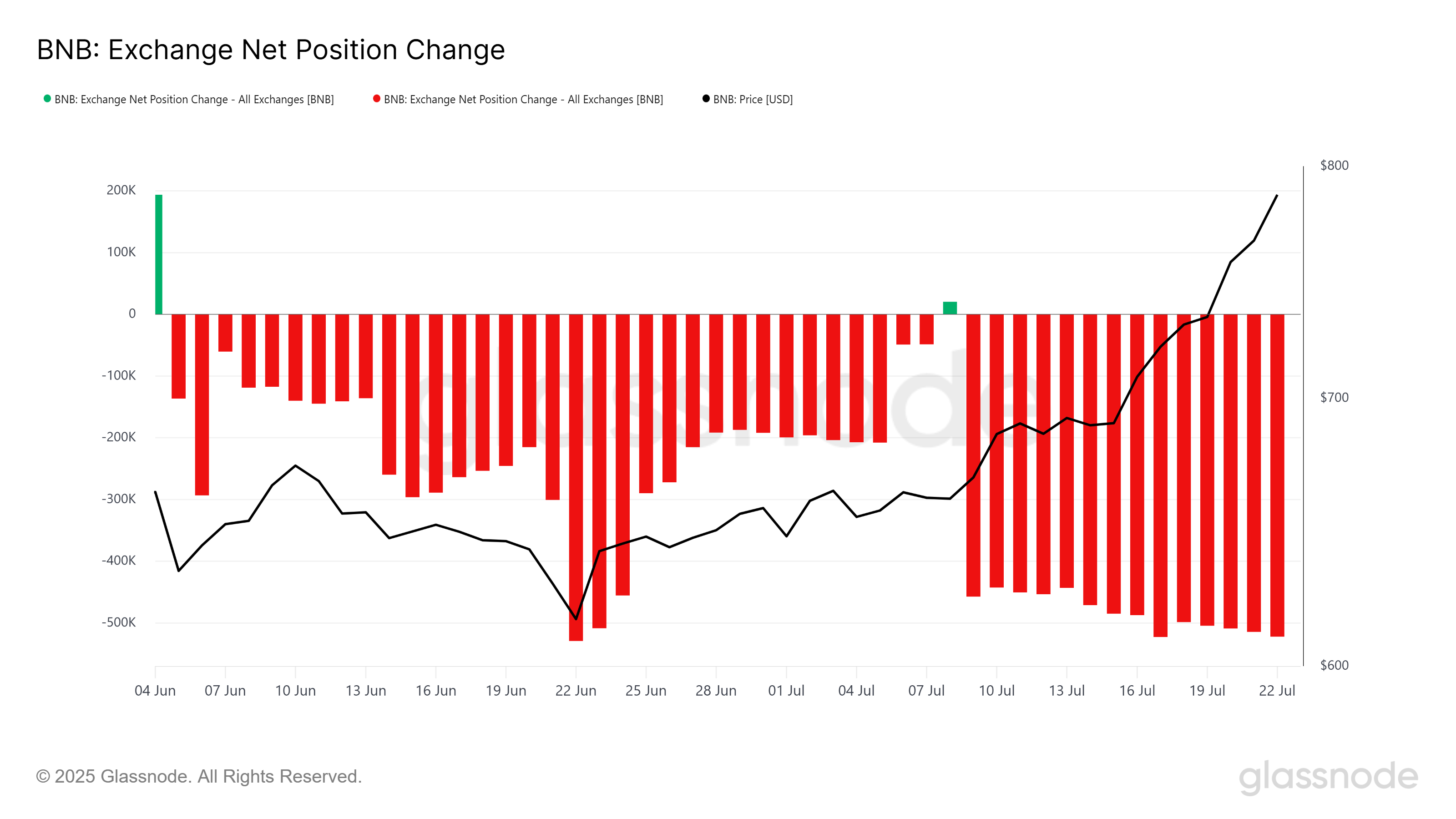 Шамамен жеті апта бойы BNB тұрақты жинақтауды көрді. Бұл тренд биржаның таза позиция өзгерісінде көрініс тапты, ол альткоинге деген инвесторлардың қызығушылығының артып келе жатқанын көрсетеді. Холдингтердің тұрақты өсуі мен оң нарықтық белгілер соңғы раллидің негізгі қозғаушы күші болды.