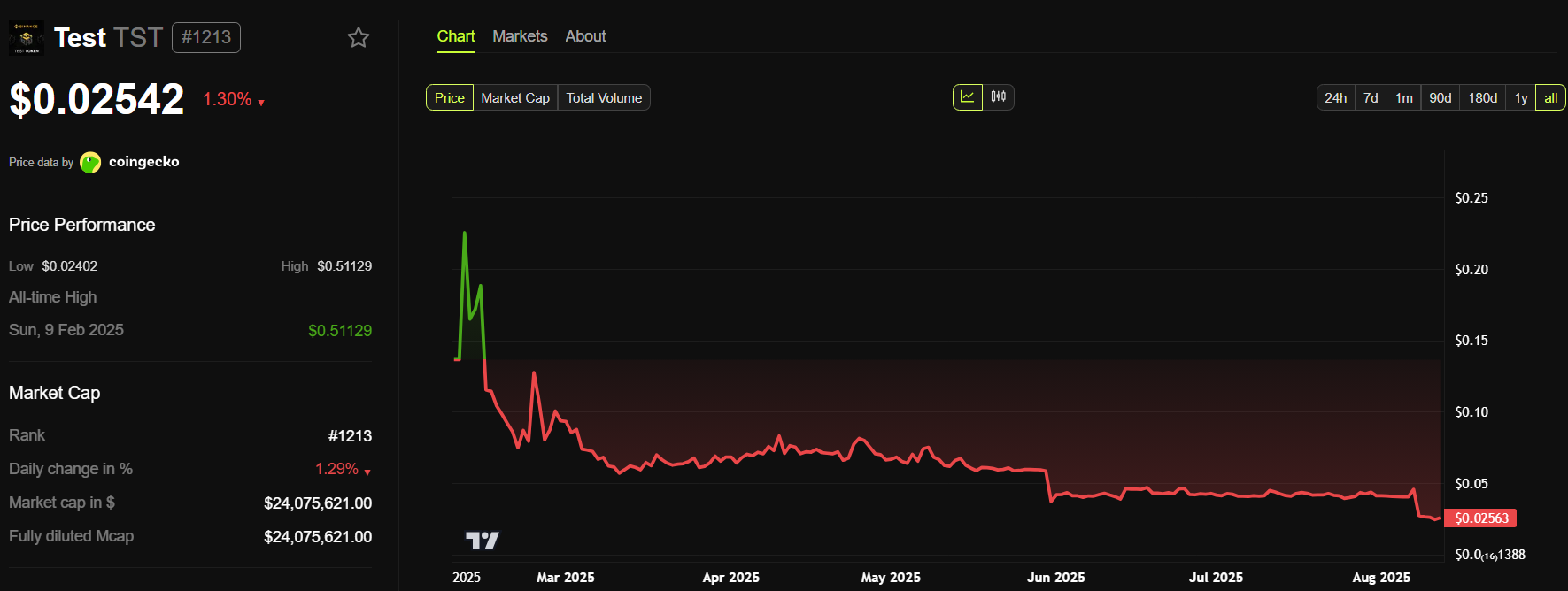 Қазіргі уақытта баға шамамен 0,02 доллар деңгейінде саудалануда, бірақ BeInCrypto деректері көрсеткендей, іске қосылғаннан бері TST-нің бүкіл баға тарихы ұзаққа созылған төмендеу үрдісін көрсетеді.