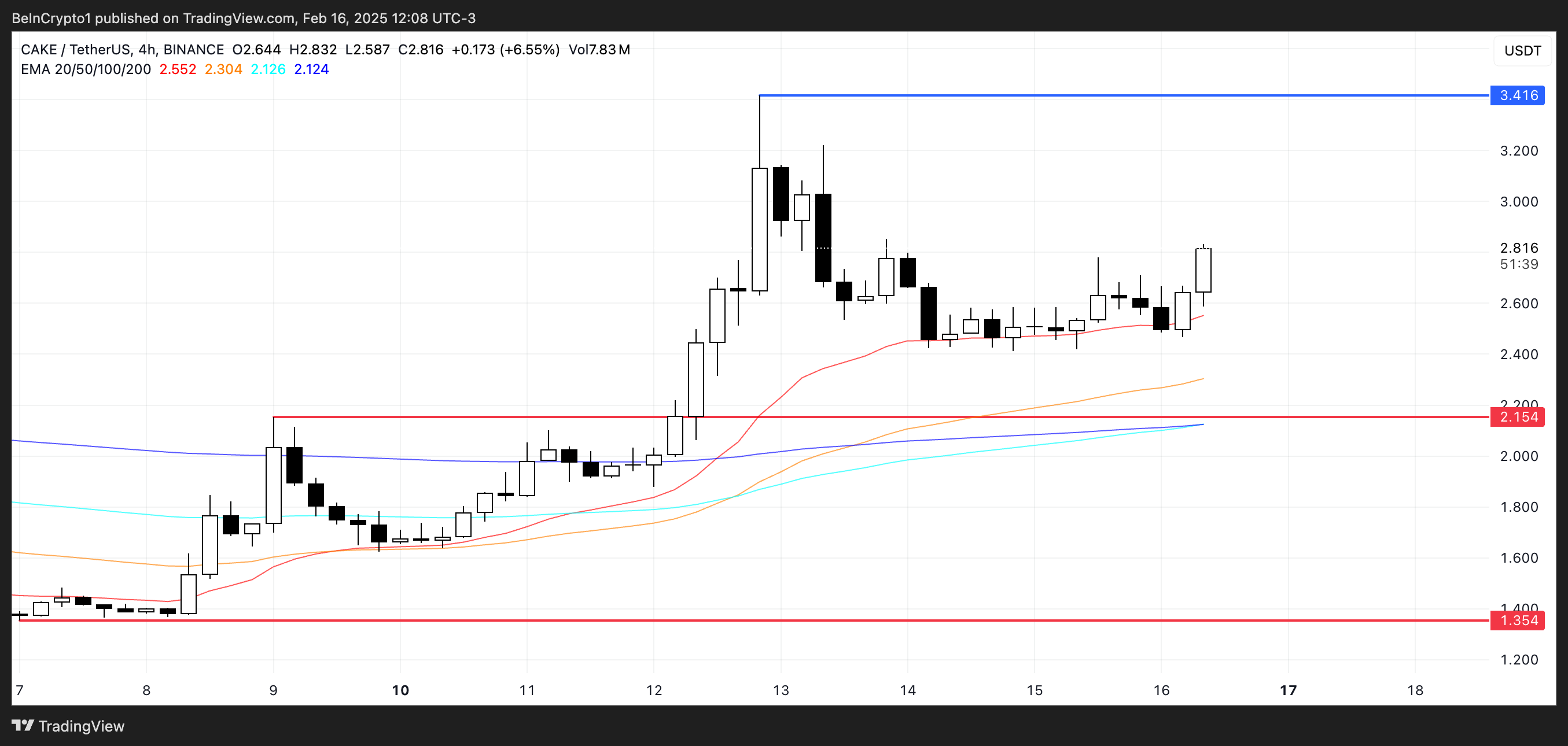 Егер қарқын жалғаса берсе, CAKE 3,41 доллар қарсылығын сынауға көтерілуі мүмкін. Егер бұзу орын алса, ол жоғары көтерілуі мүмкін, бірақ егер тренд кері бұрылса, ол 2,15 долларға дейін төмендеуі мүмкін. Бұл қолдауды жоғалту 1,35 долларға дейін төмендеуге жол ашуы мүмкін.