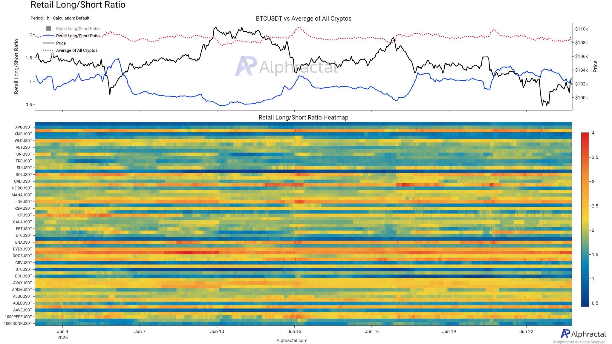 Alpharactal деректері бөлшек Long/Short қатынасының төмендеу үрдісін көрсетеді. Бөлшек инвесторлар Bitcoin мен альткоиндерді шорттап жатыр. Бұл жылу картасынан көрінеді, ол қазір негізінен салқын түстермен жабылған.
