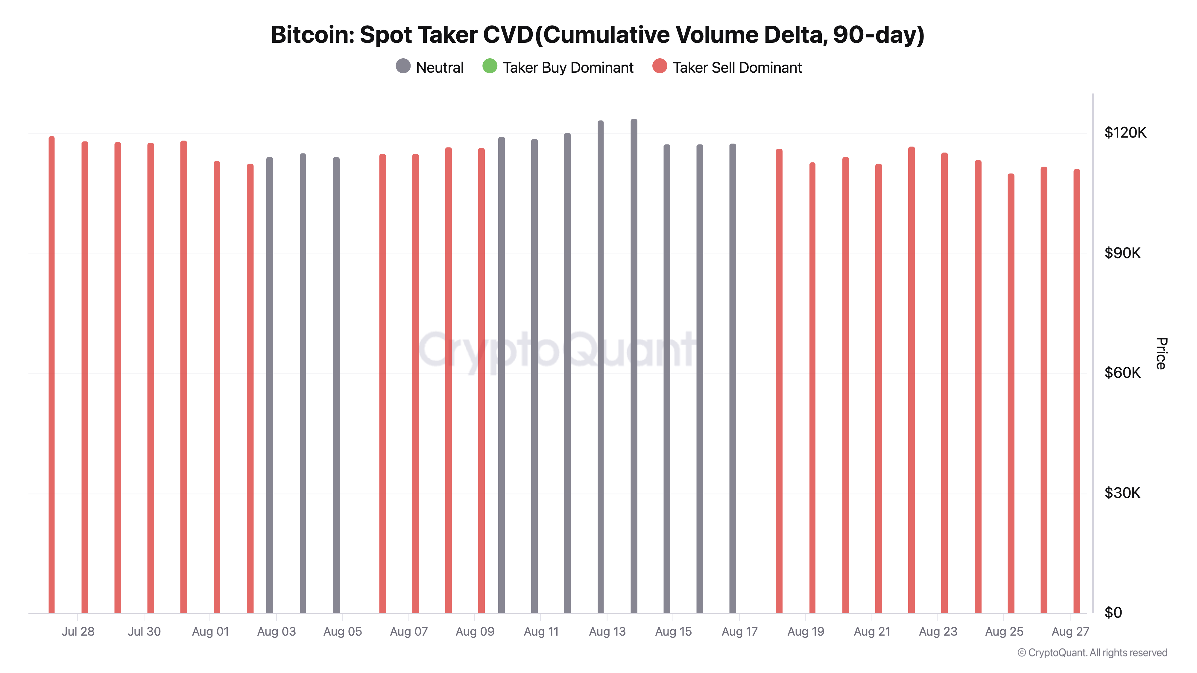 Нарық қатысушыларының негізінен сатып алушылар немесе сатушылар екенін бақылайтын Spot Taker CVD бірнеше ай бойы сатып алу жағы басым болғаннан кейін қызылға ауысты. Бұл ауысу жаңартылған сату қысымын білдіреді, бұл тарихи тұрғыдан түзетулердің алдында болған үлгі.