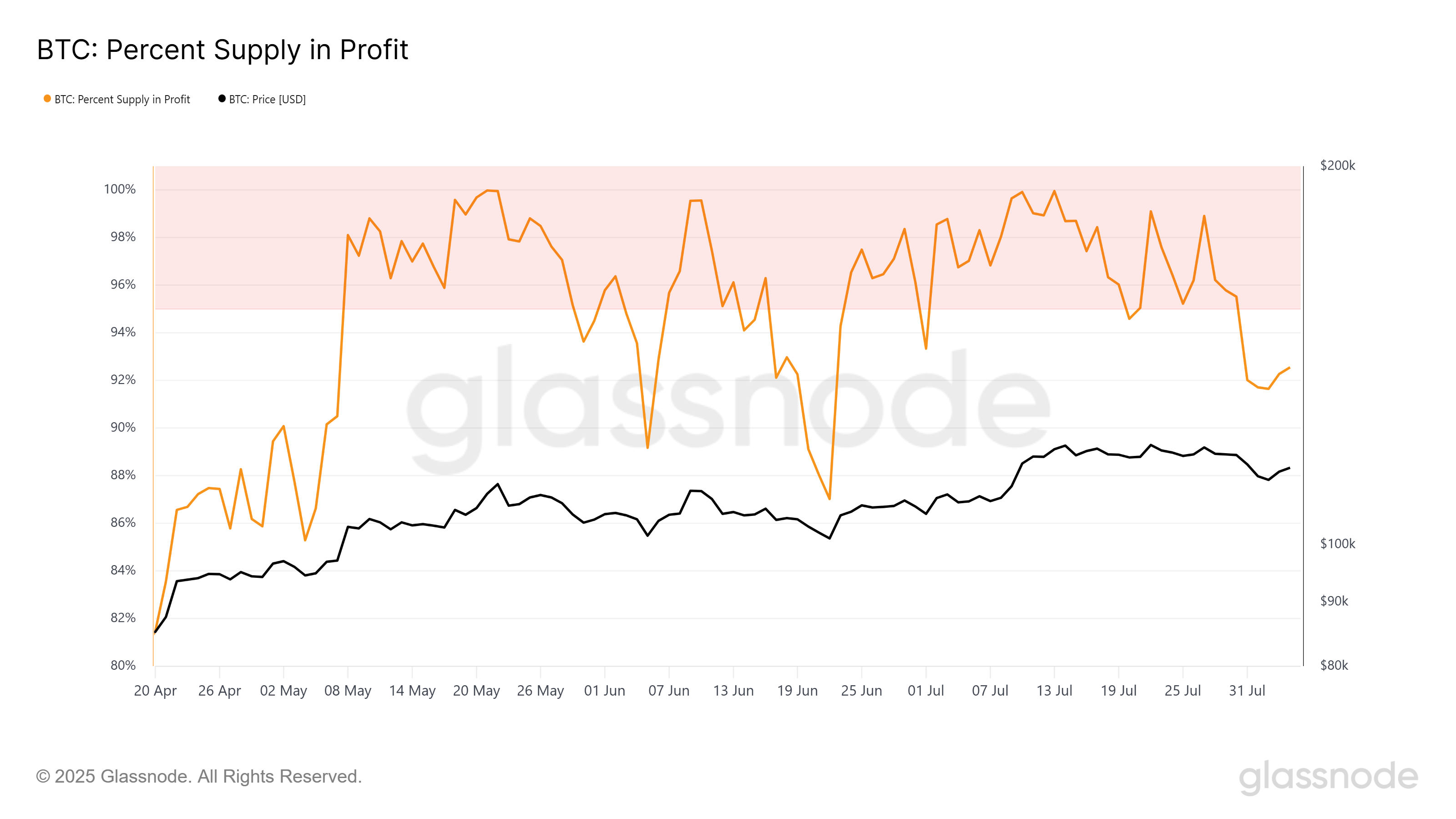 Осы аптада Bitcoin-ның пайдадағы ұсынысы 95%-дық шектен төмен түсті, бұл тарихи тұрғыда нарықтың шыңын білдіреді. Бір айдан астам уақыт бойы Bitcoin-ның ұсынысы 95% пайда аймағында қалды, бұл шамадан тыс бұқа нарығын білдіреді.