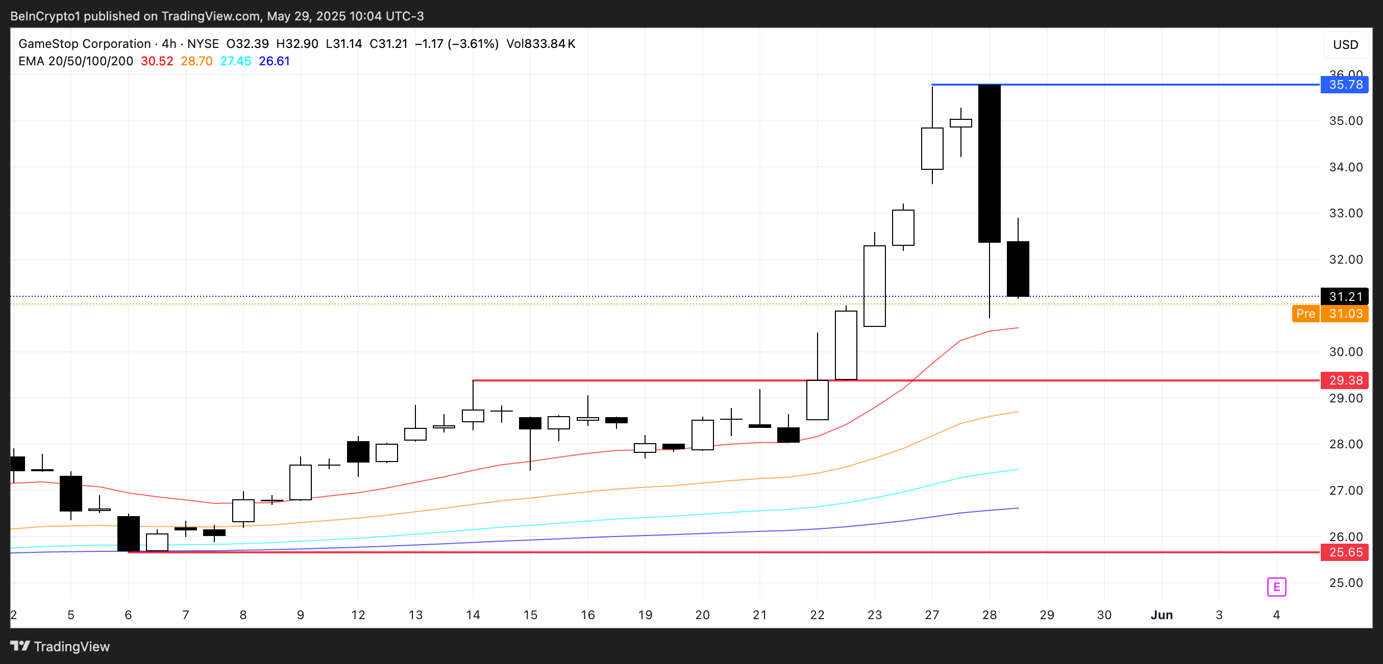 GME алдын ала нарықта тағы 0,32%-ға төмендеді. Егер түзету жалғаса берсе, ол 29,38 доллардағы қолдауды сынауы мүмкін. Ұзақ мерзімді төмендеу тренді акцияны қысқа мерзімде 25,65 долларға дейін төмендетуі ықтимал.