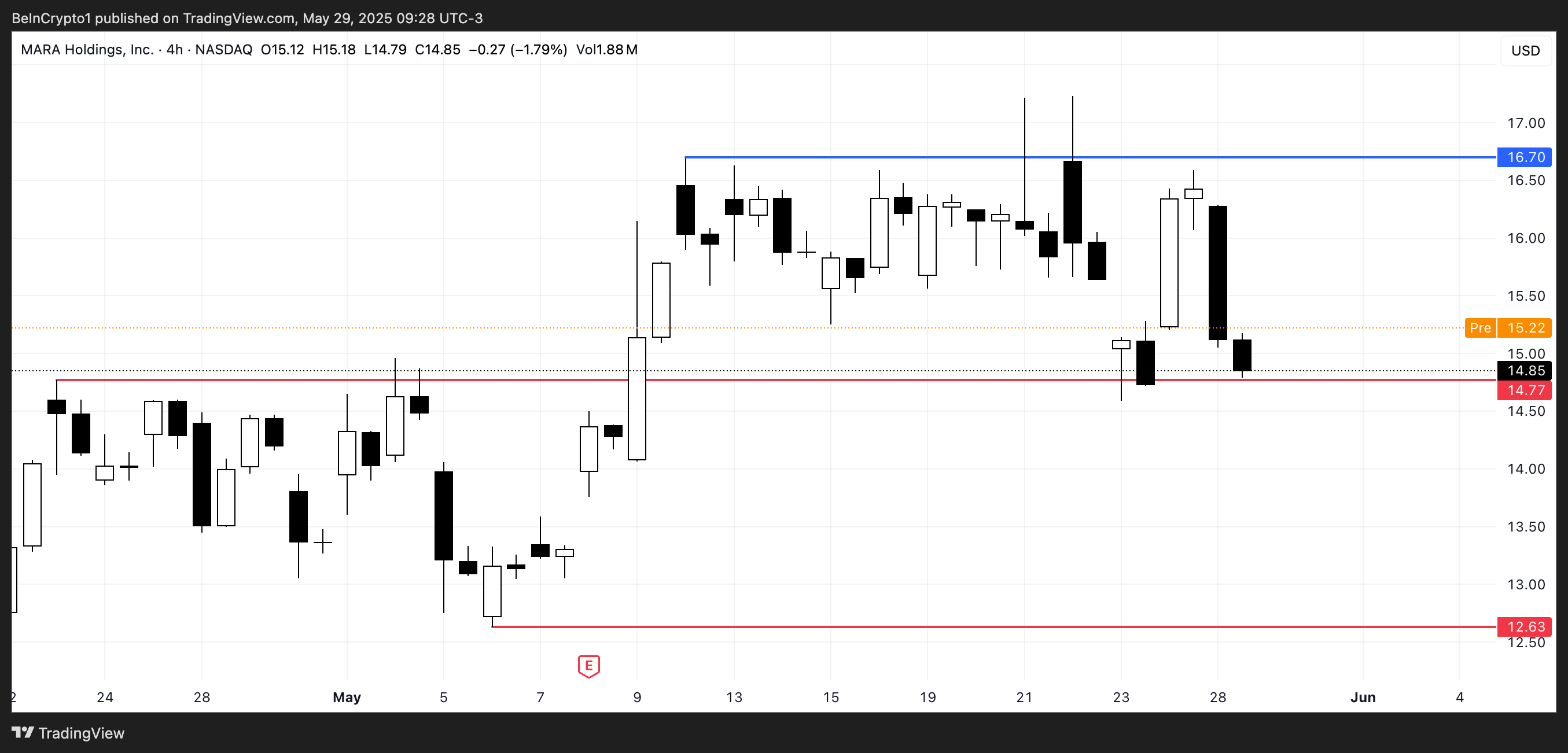 Егер түзету жалғаса берсе, MARA 14,77 доллардағы қолдауды қайта сынауы мүмкін, әрі қарай 12,63 долларға дейін төмендеу қаупі бар. Жоғары қарай, импульстің өзгеруі акцияны 16,50 доллардан жоғары итермелеуі мүмкін, 16,70 доллардағы қарсылықпен.