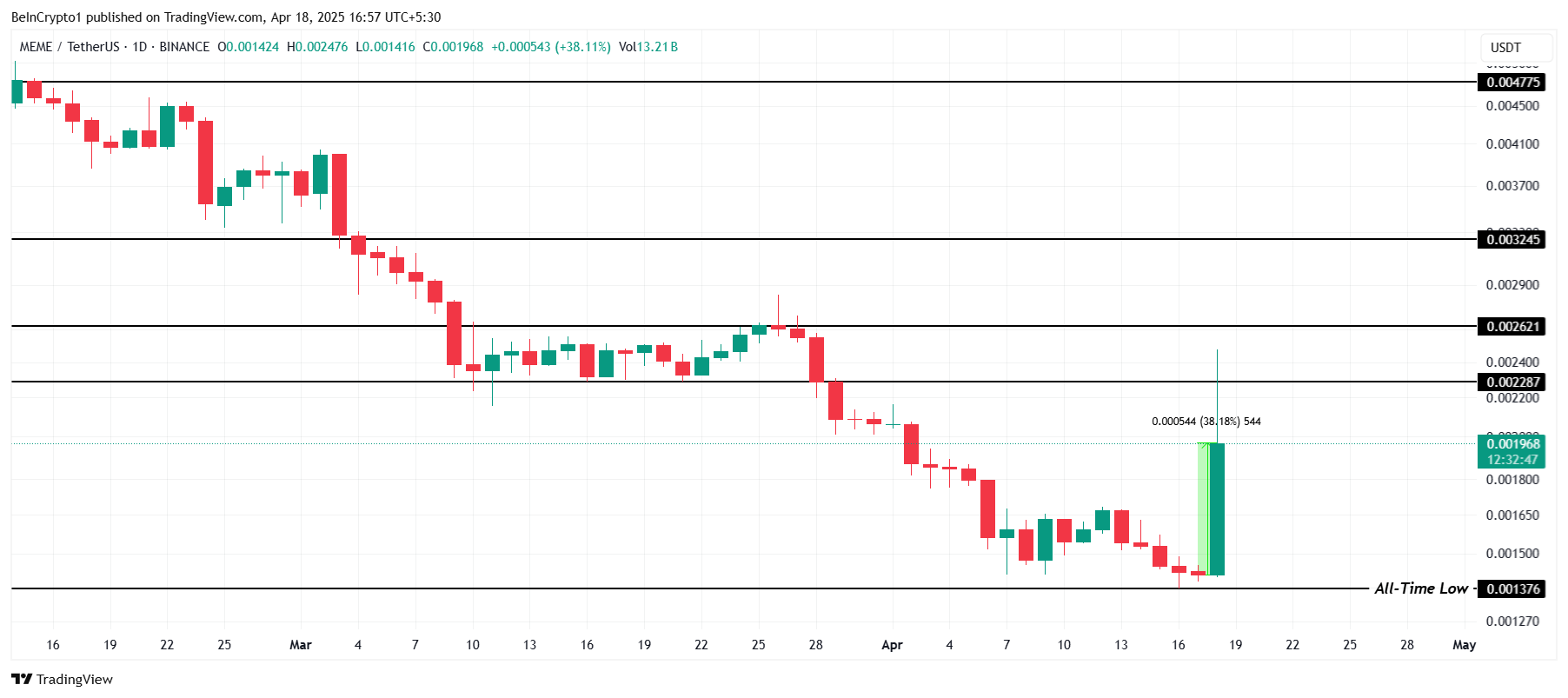 MEME қиын апта өткізді, жаңа тарихи минимумға 0,00137 долларға жетті. Алайда, альткоин күрт қалпына келіп, соңғы 24 сағатта 38%-ға өсіп, 0,00196 долларда саудаланды. Бұл өсу мемкоиндерге деген жаңартылған қызығушылықтың арқасында айтарлықтай қалпына келуді білдіреді.