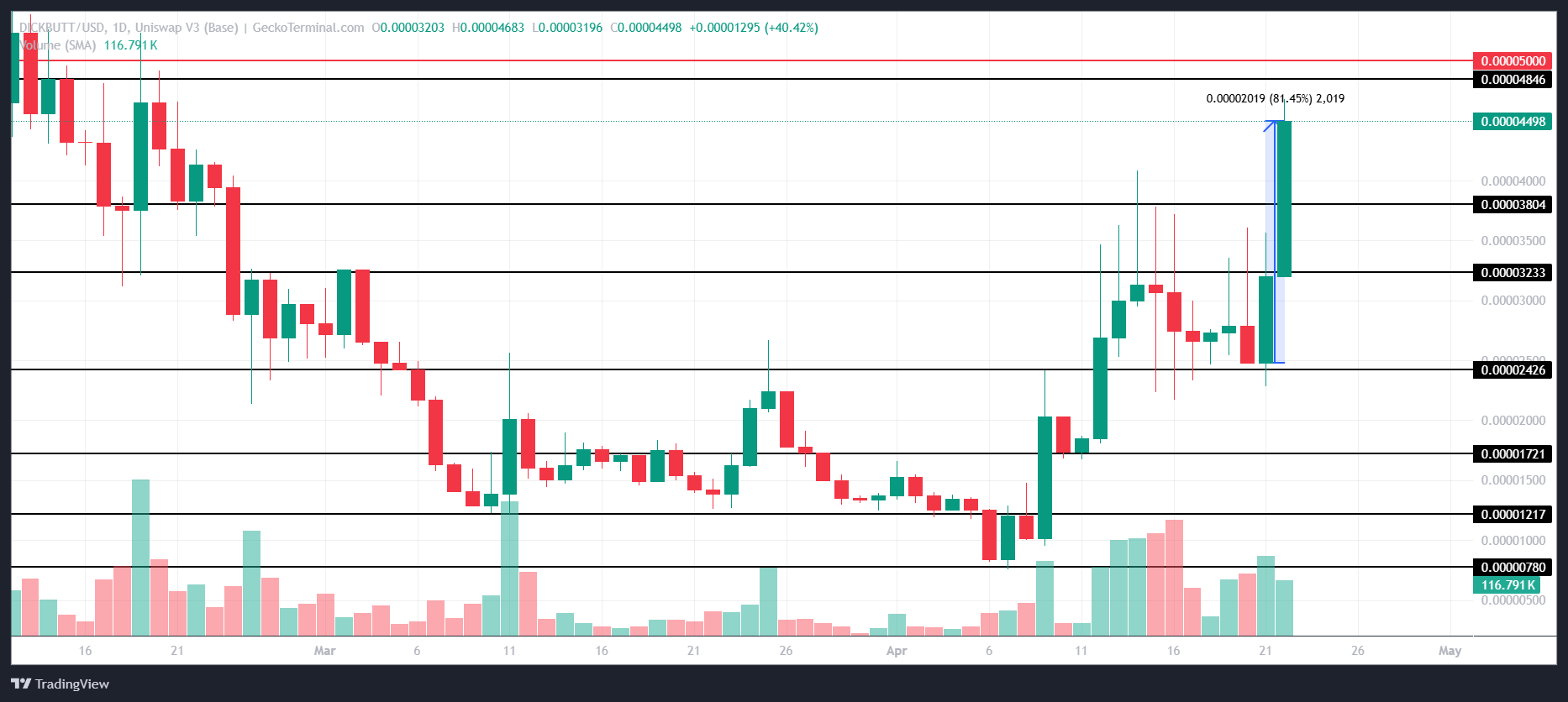 Бақылауға тұрарлық тағы бір үздік мемкоин – DICKBUTT, ол бүгін 81%-ға әсерлі өсті, 0,00004498 доллар деңгейінде саудаланып жатыр. Мемкоин қазір 0,00004846 доллар кедергісіне жақындап, бұл деңгейді бұзуға ұмтылуда. Егер сәтті болса, ол өзінің өсу импульсін жалғастырып, инвесторлар үшін одан әрі пайда әкелуі мүмкін.