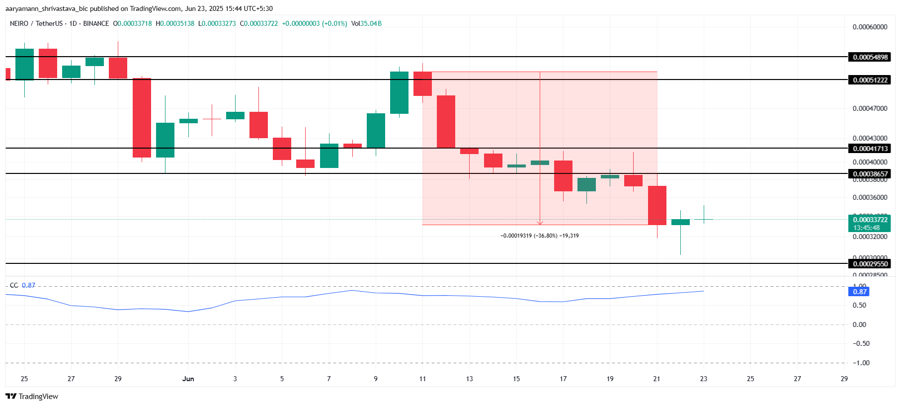 NEIRO соңғы 12 күнде 26,8%-ға төмендеді, бұл жаһандық шиеленістердің өсуіне байланысты. Мемкоин қазіргі уақытта 0,000337 доллардан саудаланып, 0,000295 доллар қолдау деңгейінен жоғары тұр. Бұл баға әрекеті нарық жағдайы жақсарса, NEIRO ықтимал кері бұрылуға дайындалуы мүмкін екенін көрсетеді.