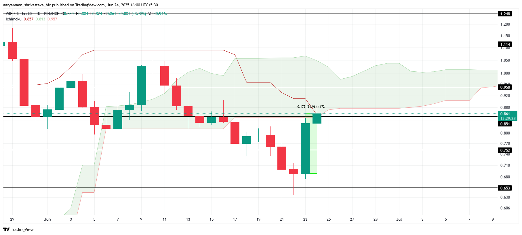 WIF бағасы соңғы 24 сағат ішінде шамамен 25%-ға өсіп, қазіргі уақытта 0,861 доллардан саудалануда. Бұл баға өсімі негізінен нарықтың бұқа импульсінен туындап, WIF-тің оң нарықтық жағдайлардан пайда көріп жатқанын көрсетеді.