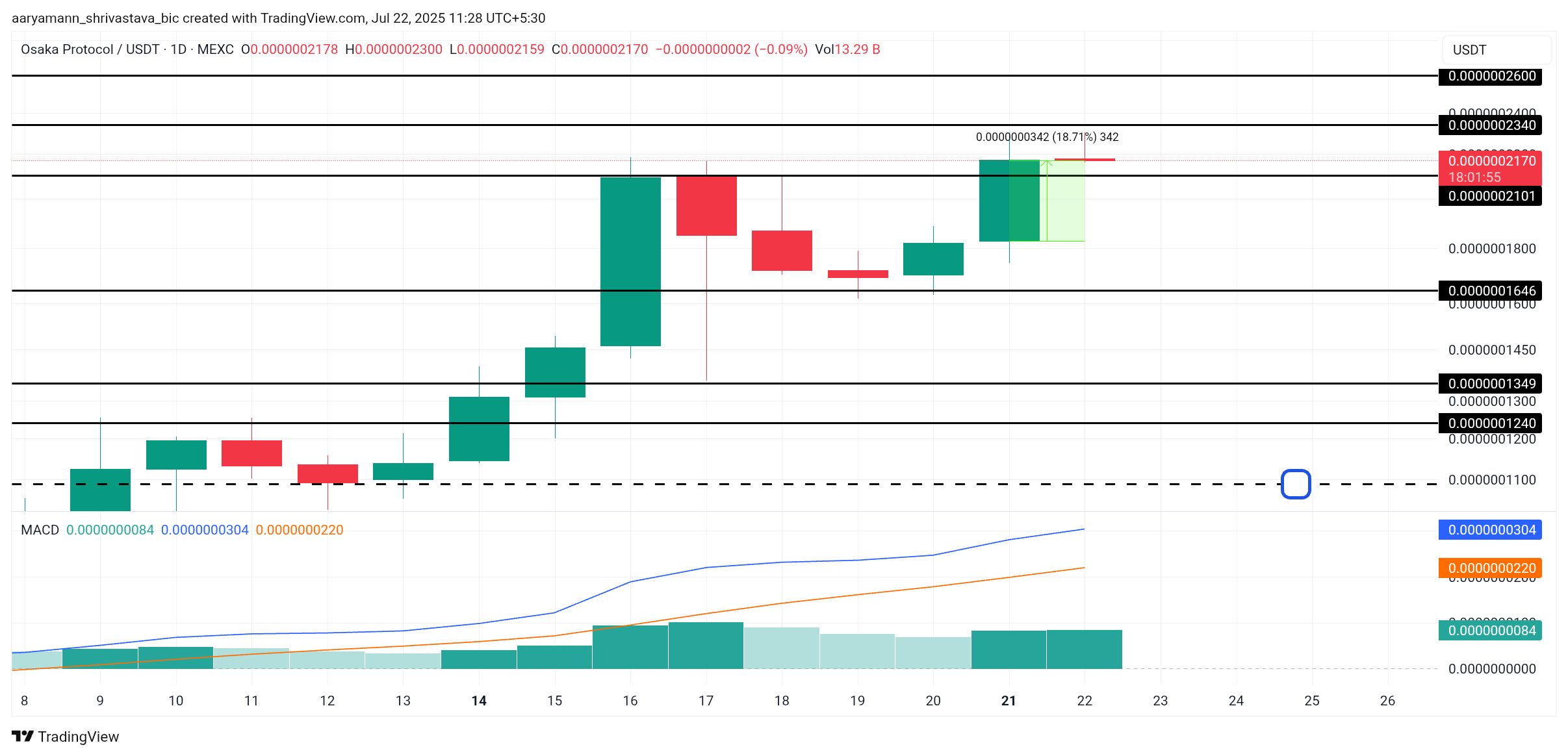OSAK соңғы 24 сағат ішінде 18%-ға өсті, қазіргі уақытта 0,0000002170 долларға саудалануда. Баға қазір 0,0000002101 доллар деңгейіндегі қолдауды сынауда. Бұл жоғары импульс мемкоиннің берік негіз қалыптастыруға тырысып жатқанын көрсетеді, бұл жақын болашақта одан әрі өсуге жол ашуы мүмкін.