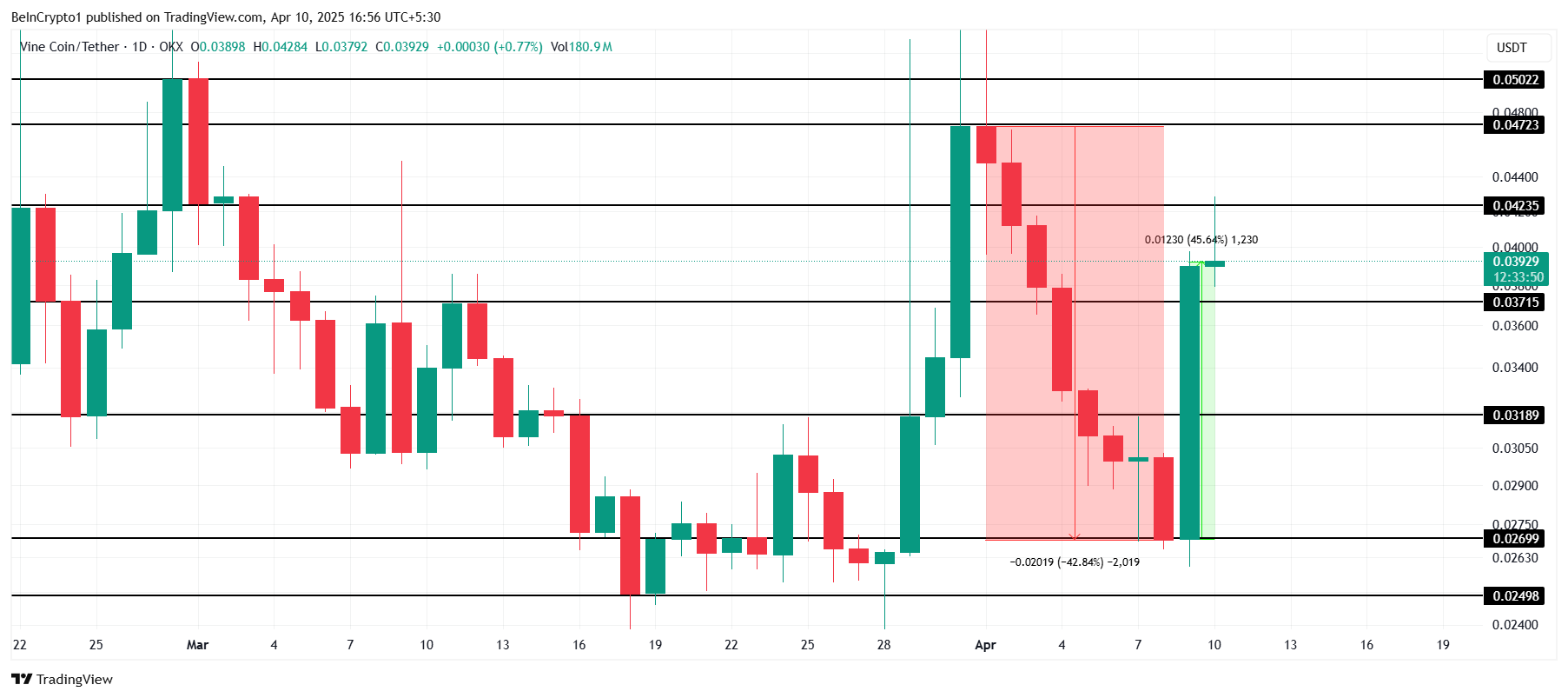 Жақында баға өскеніне қарамастан, VINE айдың басындағы 42%-дық түзетуден әлі қалпына келген жоқ. Бұл төмендеуді кері қайтару үшін мемкоин 0,042 доллар қарсылығын қолдауға айналдыруы керек. Егер бұл сәтті болса, баға 0,047 долларға дейін көтерілуі мүмкін, бұл бұқа импульсінің жалғасуын білдіреді.