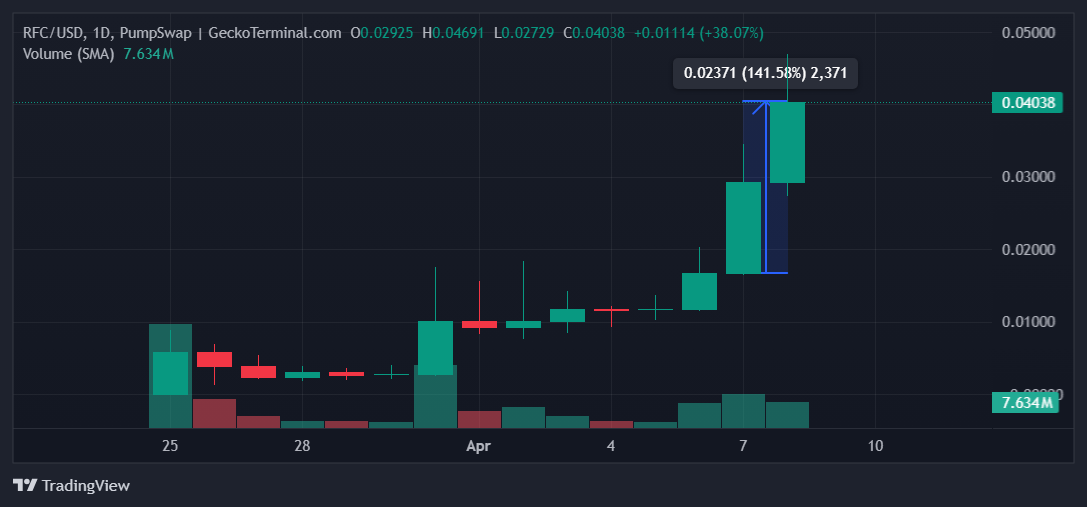 RFC бағасы соңғы 24 сағат ішінде 141%-ға өсті, осы аптада өсу үрдісін жалғастыруда. Мемкоин Илон Масктың ресми X (бұрынғы Twitter) парақшасымен өзара әрекеттескеннен кейін назар аударды. Бұл қызығушылықтың алыпсатарлық өсуін тудырды, RFC-ке назар аударуды арттыруға және нарық көңіл-күйінің өсуіне көмектесті.