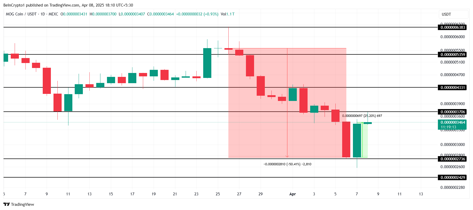 MOG бағасы соңғы 24 сағат ішінде 25%-ға өсті, наурыз айының соңындағы 50%-дық құлдыраудан кейін жеңілдік берді. Бұл қалпына келу мемкоинның импульсін қалпына келтіруге және соңғы шығындардан алшақтауға тырысуын білдіреді. Соңғы өсу одан әрі оң қозғалыстарға әкелуі мүмкін.