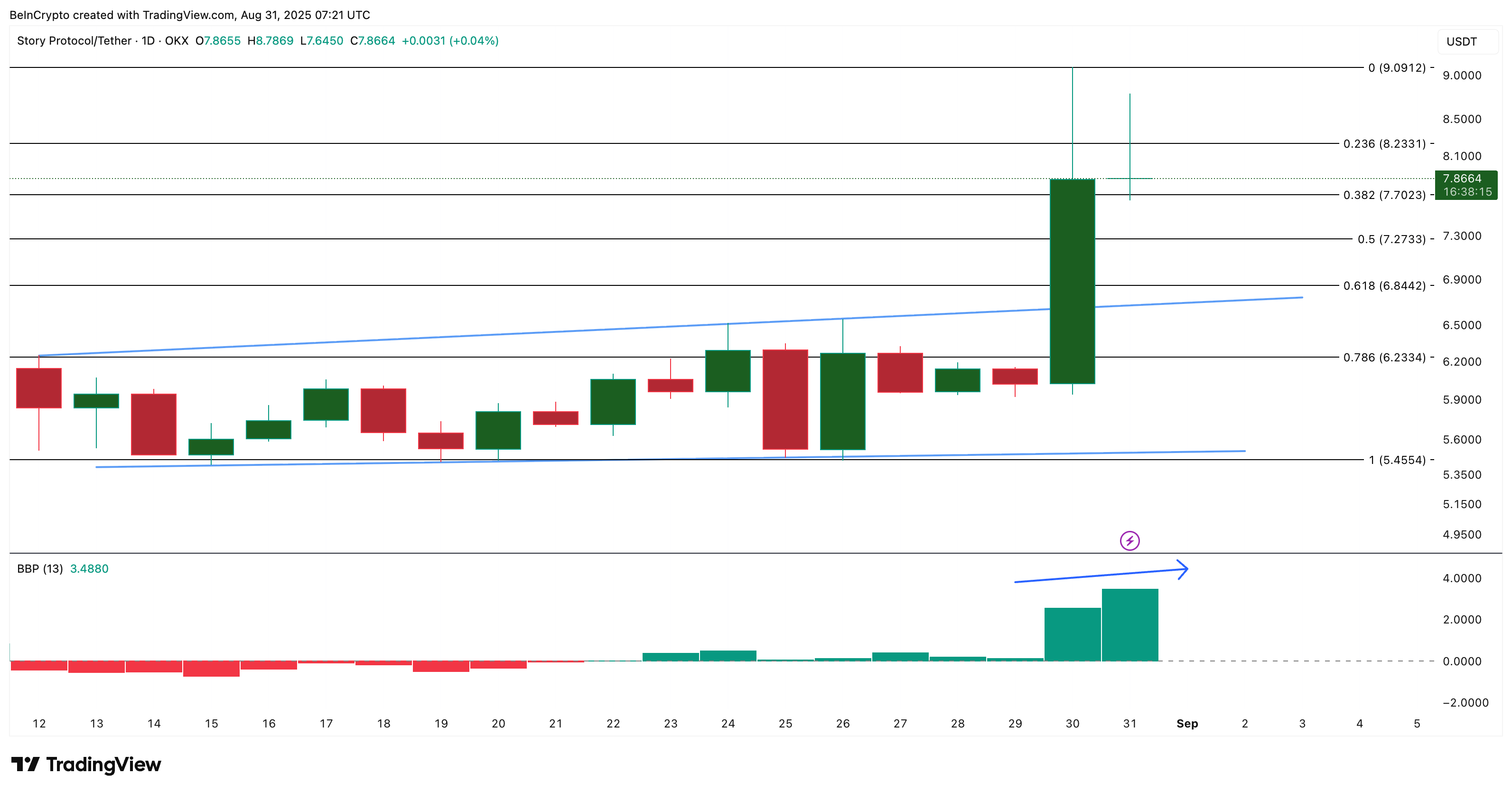 Баспасөз уақытында Story 7,86 долларда саудаланып жатыр, 8,23 доллардағы және 9,09 доллардағы тарихи максимумға жақын қарсылықпен. Осы деңгейлерден жоғары серпіліс токенді қыркүйекте жаңа шыңдарға есік ашып, баға ашу режиміне қайта орналастырады. Бұл Story-дің Made in USA монеталары тізіміндегі орнын растайды.