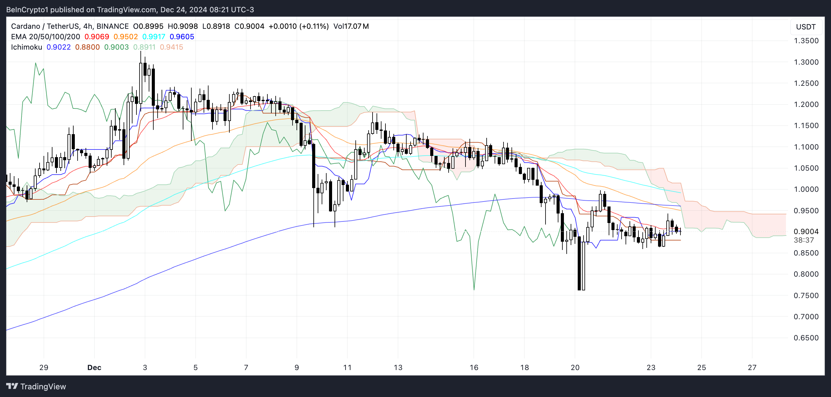 Cardano (ADA) бағасы құбылмалылықты көрсетуді жалғастыруда, соңғы жеті күнде 18%-дан астам төмендегеніне қарамастан, нарықтық капитализация бойынша ең ірі 10 криптовалюта арасында өз орнын сақтап отыр. Соңғы төмендеу үрдісі техникалық индикаторлармен белгіленді, оның ішінде EMA сызықтарында “өлім кресті” және Ichimoku Cloud-та әлсіз позиция.