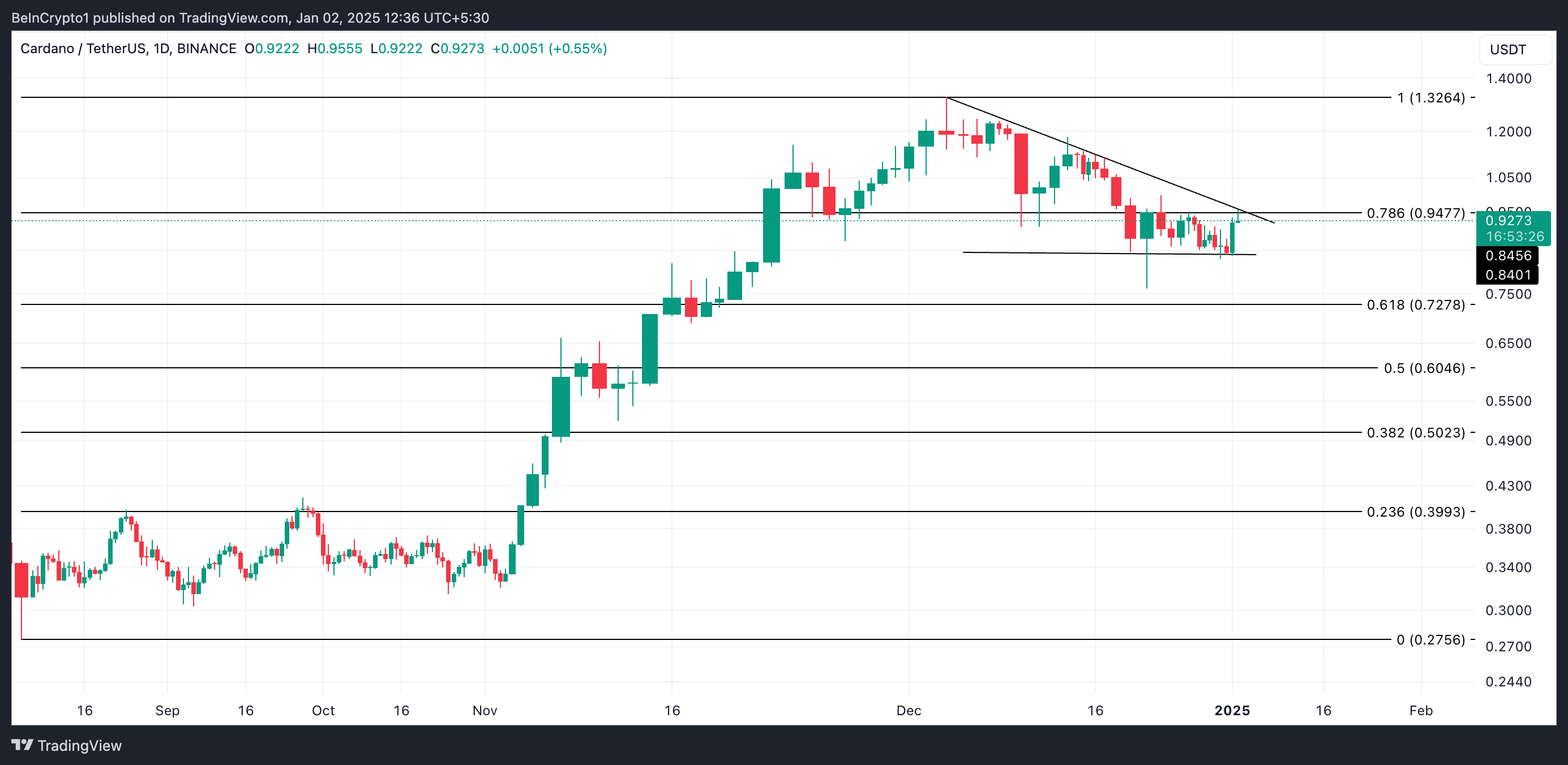 Бұл жазу кезінде ADA өзінің төмендейтін үшбұрышының жоғарғы сызығында 0,92 доллар деңгейінде саудалануда. Сатып алу белсенділігінің күшеюі бұл маңызды қарсылық деңгейінен жоғары әлеуетті бұзылуды көрсетеді, бұл Cardano бағасын екі жылдық ең жоғары деңгейге көтеруі мүмкін.