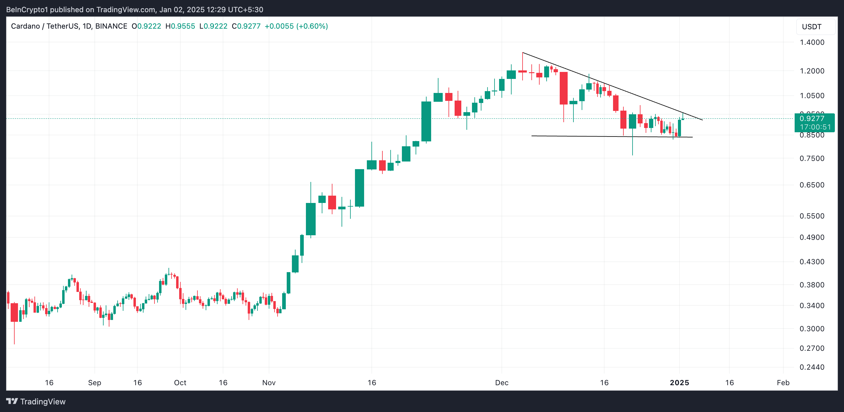 BeInCrypto-ның ADA/USD бір күндік диаграммасын бағалауы Cardano-ның 3 желтоқсаннан бастап, екі жылдық ең жоғары деңгейі 1,32 долларға көтерілген кезде, төмендейтін үшбұрыш ішінде саудаланғанын көрсетеді. Бұл аюлы үлгі активтің бағасы көлденең қолдау деңгейін сақтай отырып, бірқатар төменгі шыңдарды жасағанда қалыптасады. Бұл трейдерлер пайда табу үшін өз активтерін сататындықтан, сату қысымының артуын көрсетеді.