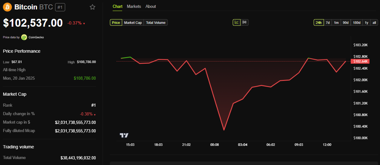 Өкінішке орай, Bitcoin бағасына әсері айтарлықтай байқалмады. BeInCrypto деректеріне сәйкес, BTC 102 537 доллардан саудаланып, сәрсенбі күнгі сессия ашылғаннан бері 0,37%-ға төмендеді.