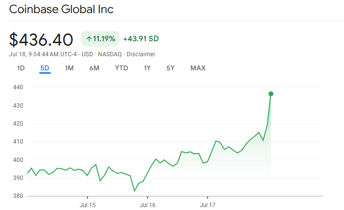 Coinbase акциялары жұма күні нарық ашылғанда, АҚШ Өкілдер палатасының екі крипто заң жобасын қабылдауынан кейін, 436 долларға жетіп, тарихи максимумға көтерілді.