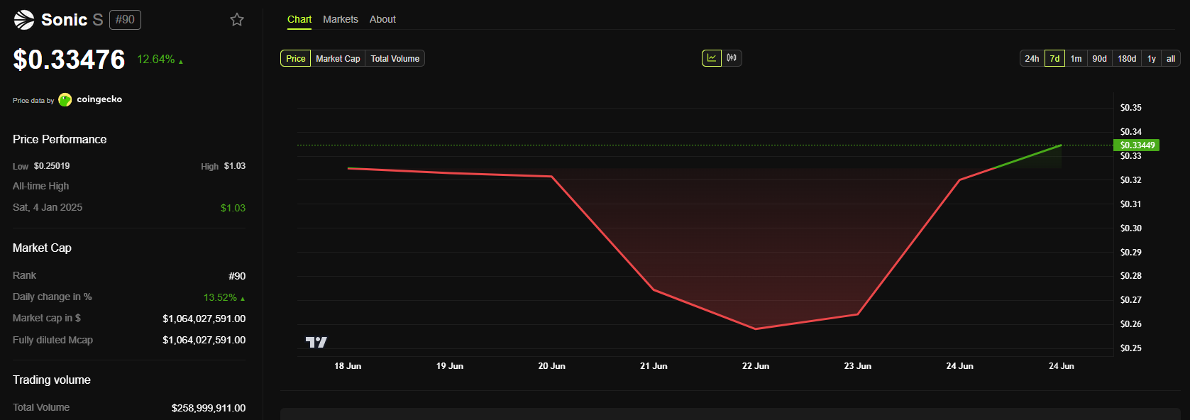 Sonic өткен аптада эйрдроп алушылардың жоғары сатылымы салдарынан айтарлықтай түзетулерге ұшырады. Алайда, Coinbase тізімге енгізілгеннен кейін альткоин бағасы күрт қалпына келді.