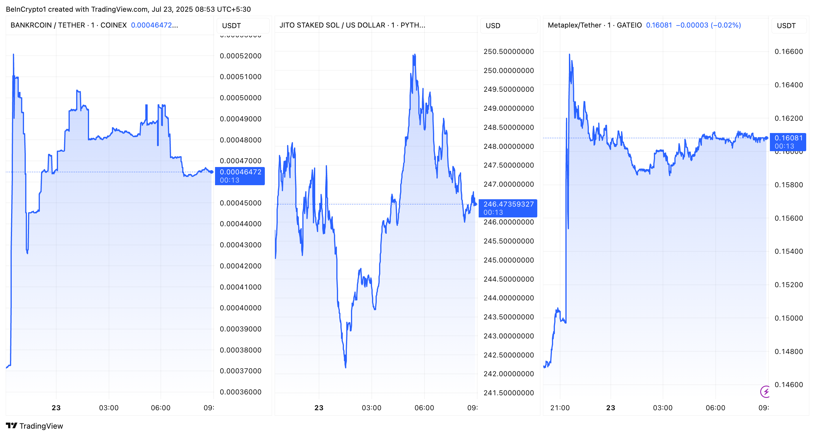 Токендерге BankrCoin (BNKR), Jito Staked SOL (JITOSOL) және Metaplex (MPLX) кіреді. Ең үлкен екі таңбалы өсімді BNKR көргенімен, бұл хабарландыру барлық үш токеннің бағасының өсуіне әкелді.