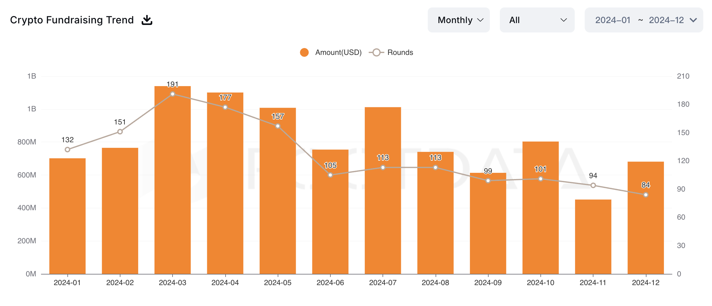 Венчурлық капитал инвестицияларының белсенділігі крипто индустриясының денсаулығының маңызды көрсеткіші болып табылады, және қазіргі деңгейлер оптимистік көрініс береді. Бастапқыда, ең күшті қаржыландыру белсенділігі жылдың бірінші жартысында болды, кейінгі айларда тұрақты төмендеу байқалды. Алайда, Трамптың АҚШ Президенті болып қайта сайлануынан кейін, жаңа ағындар арқасында бұл үрдіс кері айналуда.