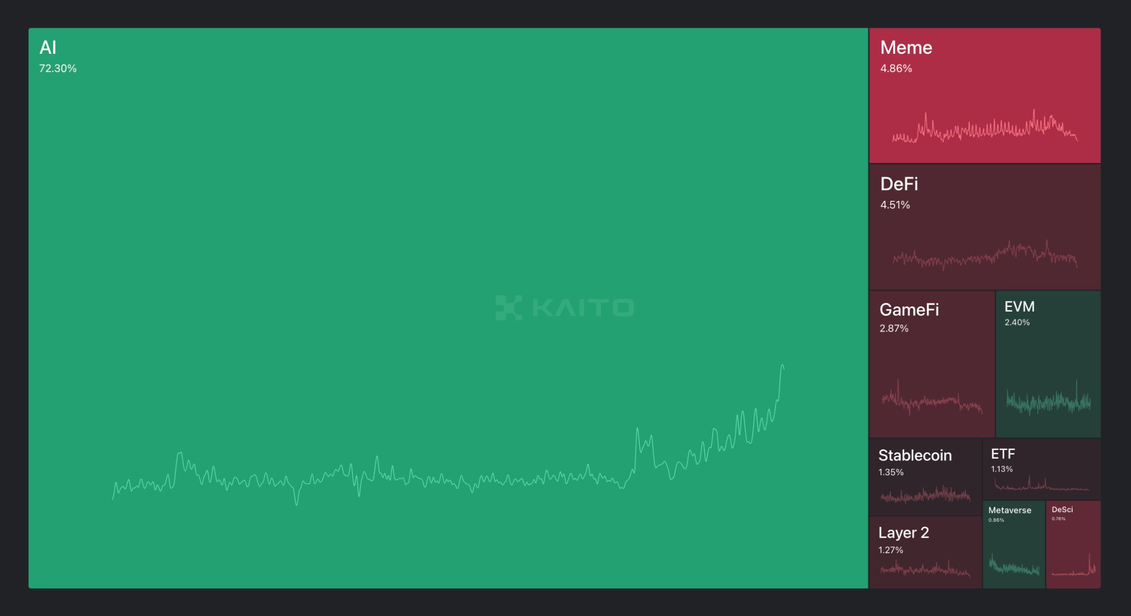 Kaito деректері бойынша ЖИ криптодағы ой бөлісінің 72% -ын басып алады, бұл Меме, GameFi және DeFi сияқты басқа секторлардан айтарлықтай асып түседі. Бұл назар аударудың өзгеруі Сэм Альтманның AGI туралы соңғы хабарламасынан кейін, ЖИ-мен байланысты жобаларға деген қызығушылық пен инвестицияны одан әрі арттырады. Кең қызығушылық ЖИ монеталарының нарықтық әңгімеде өз үстемдігін сақтап қалу мүмкіндігін көрсетеді.