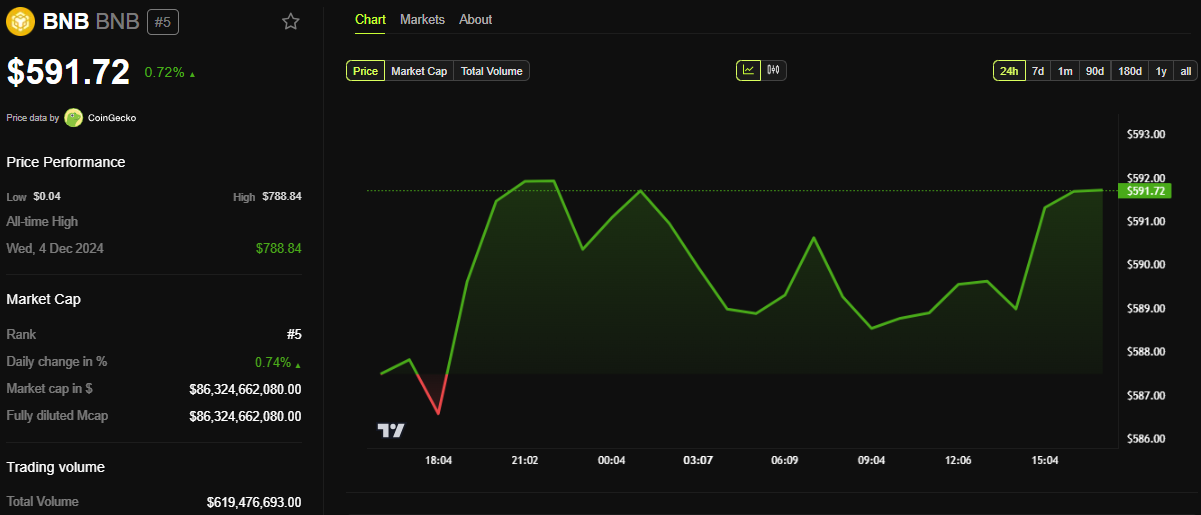 BeInCrypto деректері бойынша, осы жазба кезінде BNB 591,72 доллар-ға саудаланып, соңғы 24 сағатта 0,72%-ға өсті.