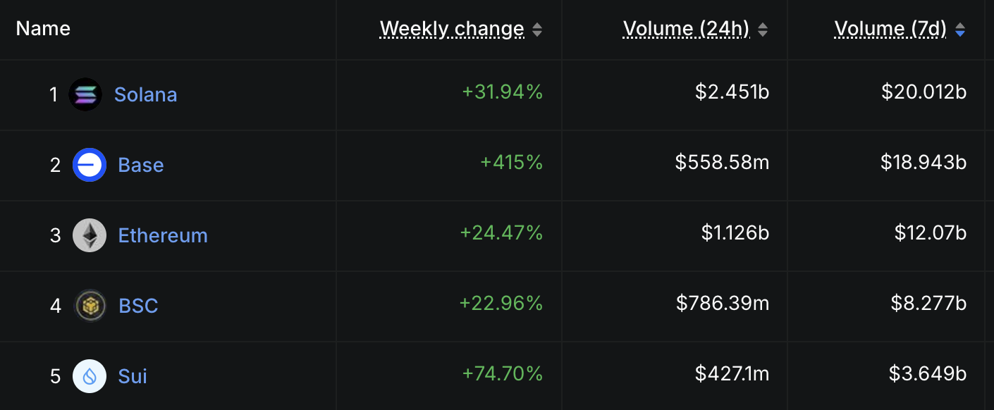 Solana әртүрлі тізбектер арасында DEX көлемінде үстемдік етуді жалғастырып, соңғы жеті күнде 20 млрд долларлық сауда көлемін тіркеді.
