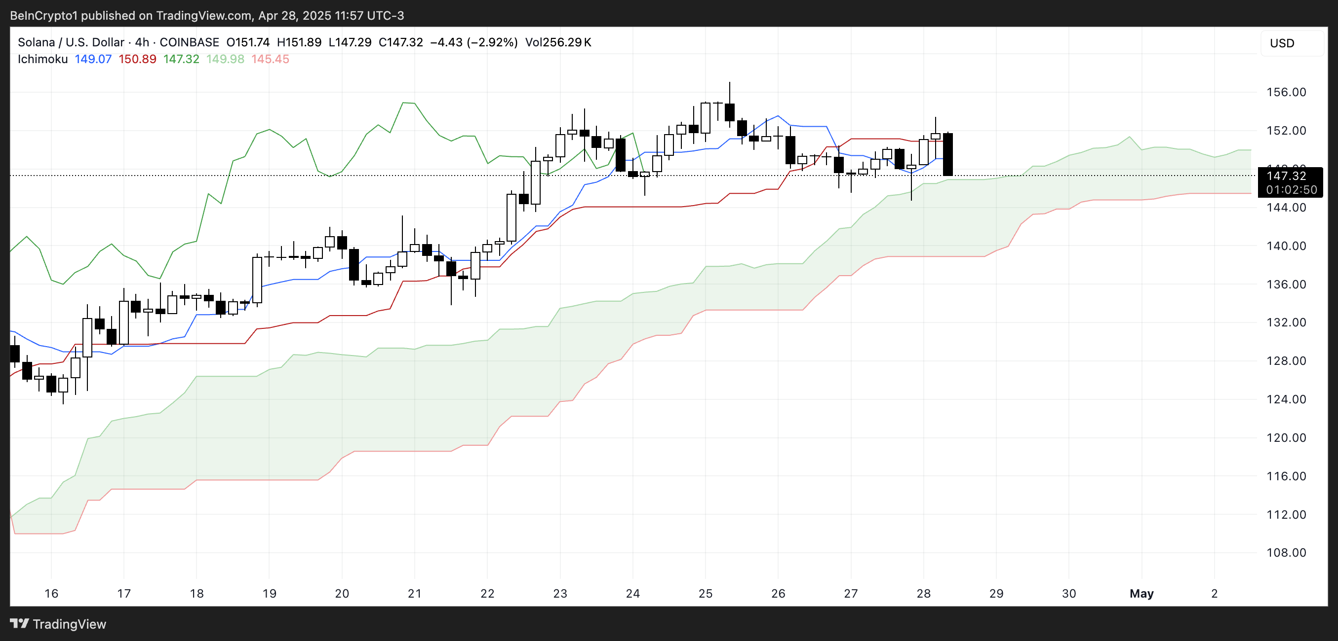 Solana-ның Ichimoku Cloud графигі бағаның жасыл бұлттың жоғарғы жағындағы қолдауды сынап жатқанын көрсетеді.