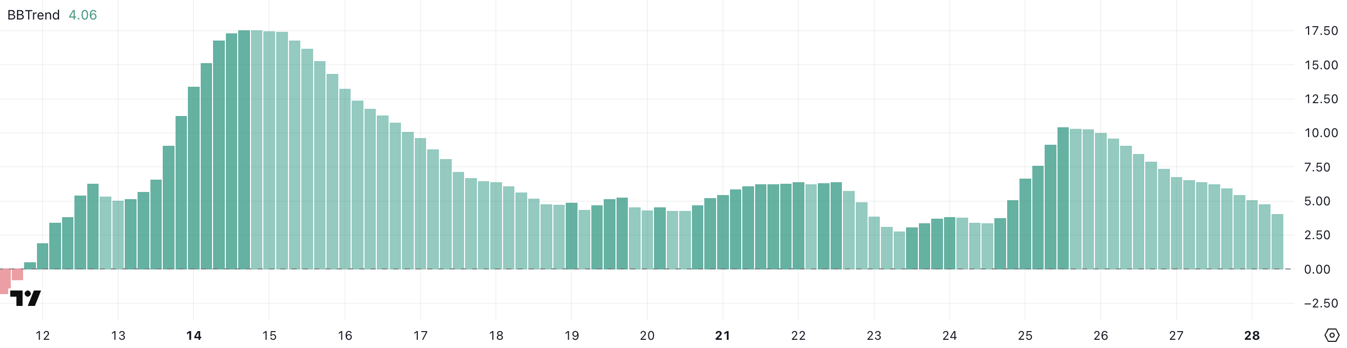 BBTrend тренд күшін Bollinger Band кеңеюі немесе қысқаруы арқылы өлшейді; BBTrend-тің төмендеуі жиі импульстің баяулауын немесе консолидацияны білдіреді.