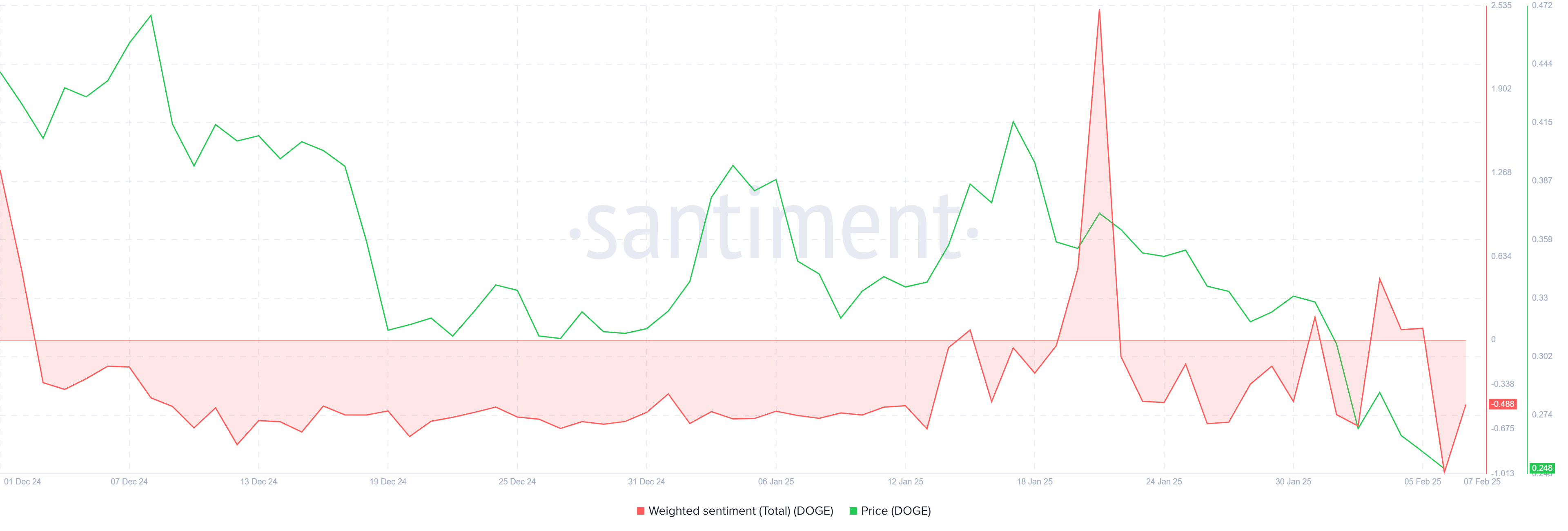 Dogecoin-ның салмақталған көңіл-күйі теріс аймаққа кірді, себебі инвесторлар арасында күмән күшейіп келеді. Үздіксіз төмендеу және мағыналы қалпына келтірудің болмауы аюлық болжамдарға ықпал етті.