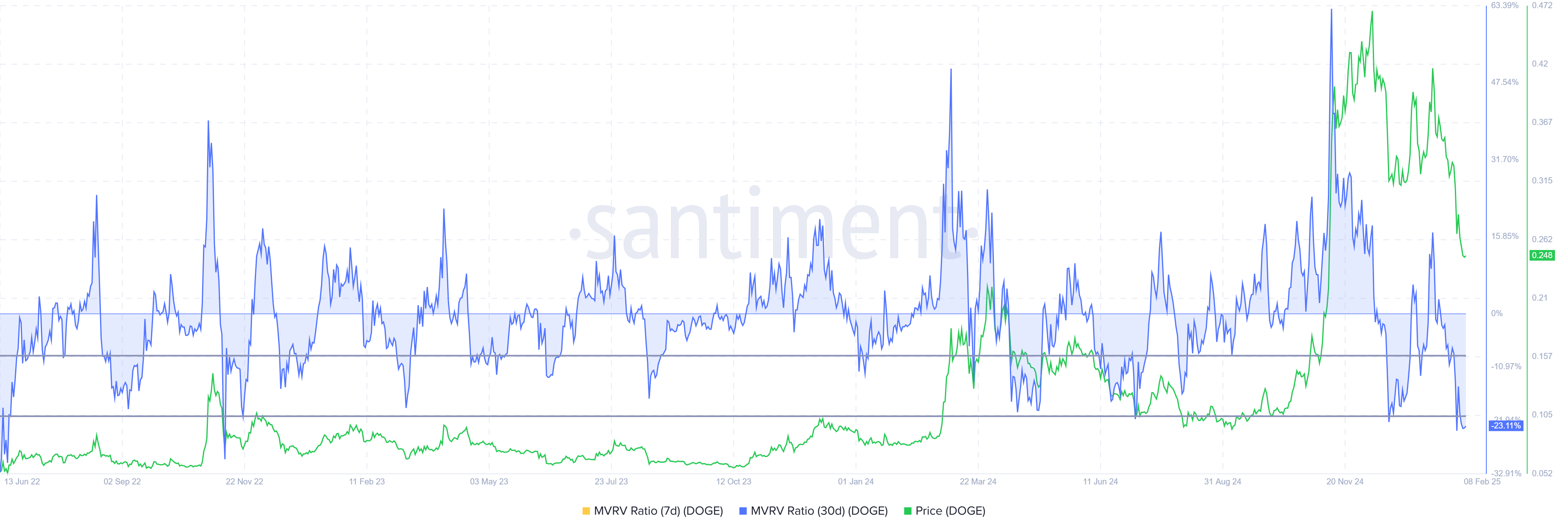 Dogecoin-ның кең нарықтық болжамы Нарықтық құнның жүзеге асырылған құнға (MVRV) қатынасы арқылы көрсетілгендей, әлеуетті сатып алу мүмкіндігін ұсынады. Қазіргі уақытта -23% деңгейінде тұрған бұл көрсеткіш тарихи мүмкіндік аймағынан төмен, ол -9% және -21% аралығында. Өткен циклдарда DOGE осы деңгейлерден қалпына келген.
