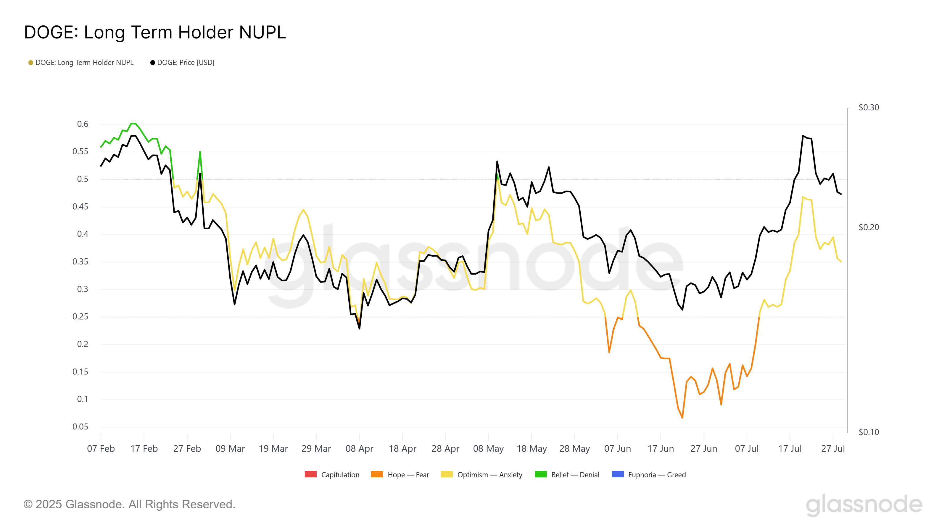 Ұзақ мерзімді таза іске асырылмаған пайда/шығын (NUPL) көрсеткіші Dogecoin иелерінің (LTHs) алдыңғы раллилерге қарағанда көбірек белгісіздікке тап болғанын көрсетеді. Бұрын LTHs 0,5 NUPL шегінен асқанда, бағаның төмендеуін жиі тудырған. Алайда, бұл жолы NUPL күтілгеннен ертерек шектен асты.