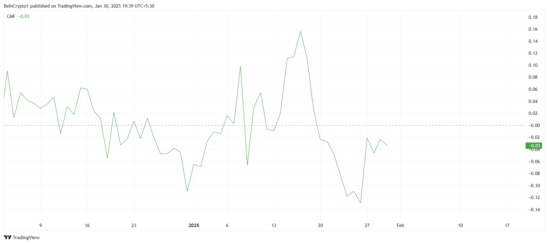 Dogecoin-ның жалпы макро импульсі туынды нарықтан тыс созылған аю көңіл-күйін көрсетеді. Chaikin Money Flow (CMF) индикаторы нөлдік сызықтан төмен қалып отыр, бұл әлсіз кірістерді білдіреді.