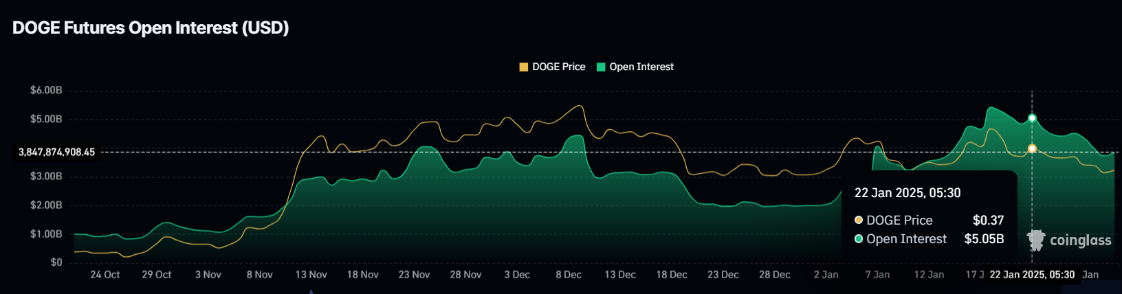 Dogecoin-дағы ашық қызығушылық айтарлықтай төмендеді, өткен аптада 1,2 млрд доллар азайды. Ол 5,05 млрд доллардан 3,85 млрд долларға дейін төмендеді, бұл трейдерлердің сенімсіздігін көрсетеді. Бағаның төмендеуі фьючерстер нарығынан кетуге әкелді, себебі трейдерлер одан әрі шығындардан аулақ болу үшін өз позицияларын жапты.