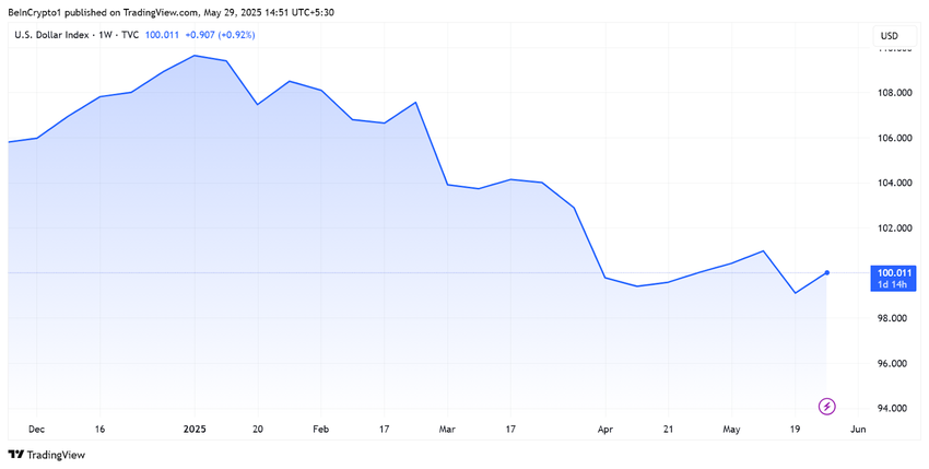 TradingView деректері бойынша, АҚШ DXY жыл басынан бері тұрақты төмендеуде, жыл басынан бері шамамен 10%-ға төмендеді. 13 қаңтарда 110,176 ішкі күндік максимумын орнатқаннан кейін, осы жазбаға сәйкес 100,011-ге дейін 10-нан астам пунктке төмендеді.