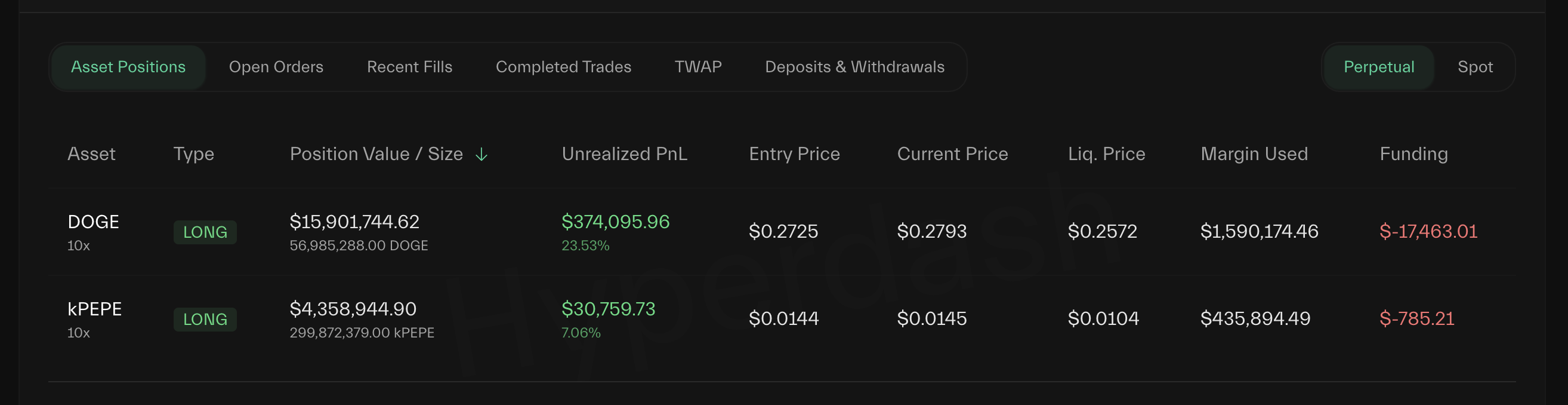 Уиннде әлі де екі ашық левереджді позиция бар. Оған 10× DOGE-ге ұзақ позиция кіреді, ол 374 095 доллар нереализденген пайдада тұр. Тағы бір 10× PEPE-ге ұзақ позиция қазіргі уақытта 30 759 доллар нереализденген пайда көрсетуде.