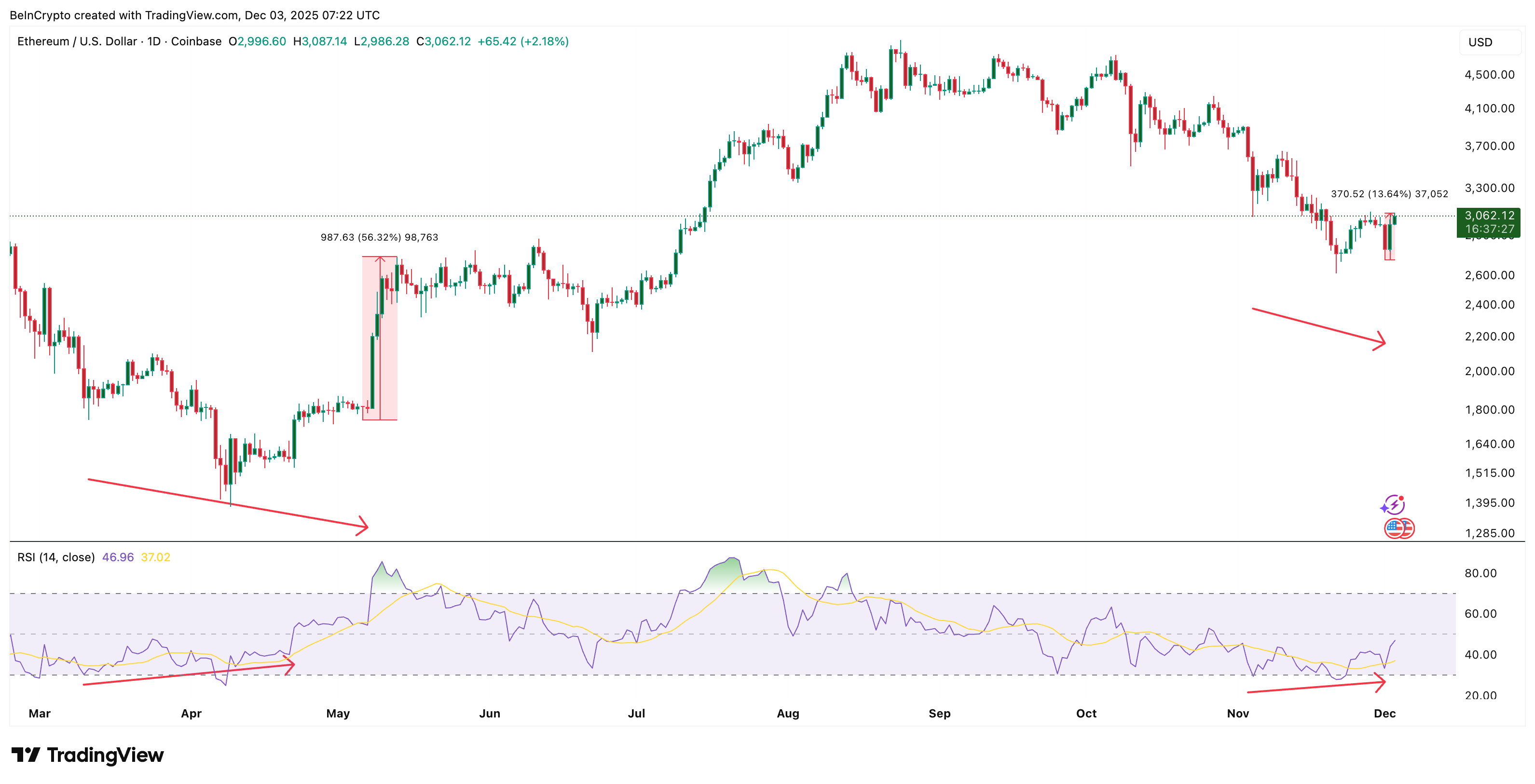 4 қараша мен 1 желтоқсан аралығында ETH төмен түсу жасап, бірақ RSI жоғары төмендік қалыптастырды. Бұл Pectra қозғалысы алдындағы дәл құрылымға сәйкес келеді.