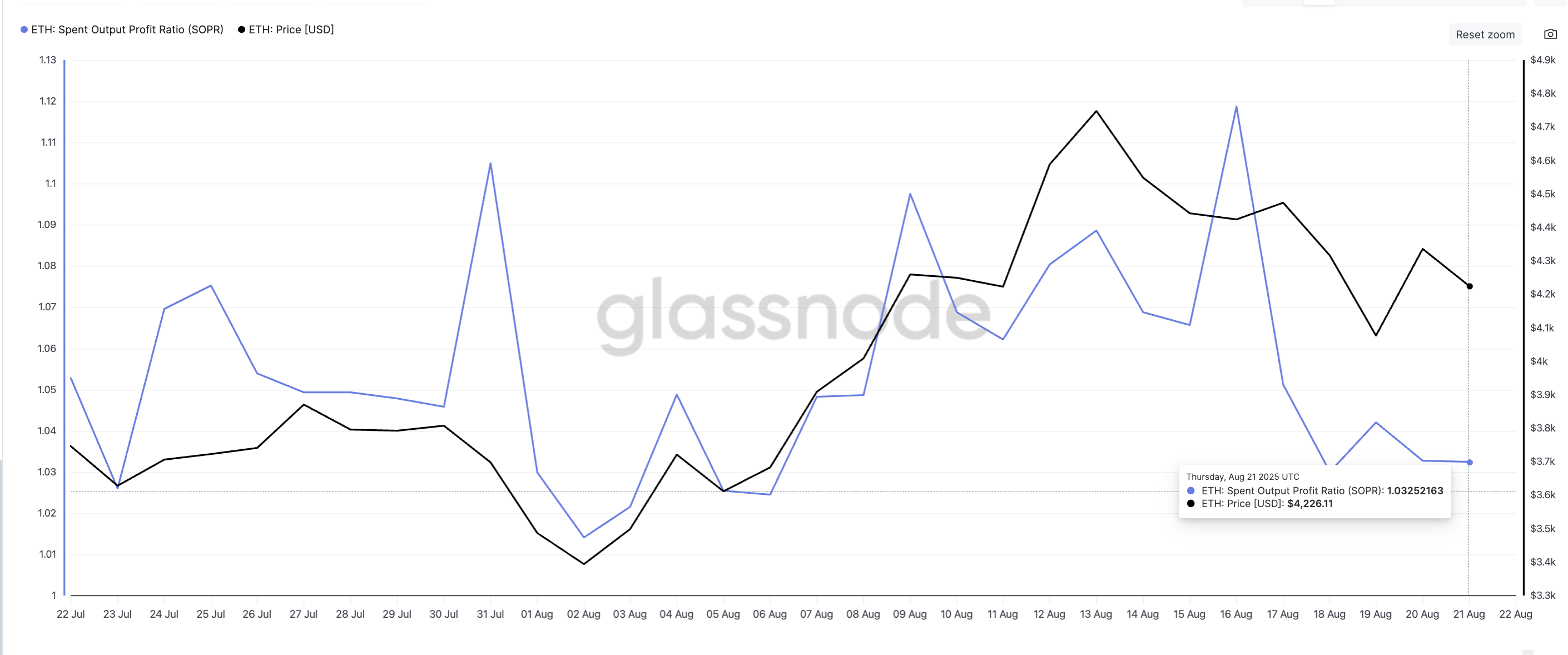 Өткен аптада ETH-тің SOPR 1,11-ден 1,03-ке дейін төмендеді. Соңғы рет осындай қозғалыс 31 шілдеде байқалды, сол кезде коэффициент 1,10-дан 1,01-ге дейін төмендеді. Сол кезде төмендеу нарықтың төменгі деңгейін белгіледі. ETH келесі күндері 3 612 доллардан 4 748 долларға дейін көтерілді — 31%-ға өсті.