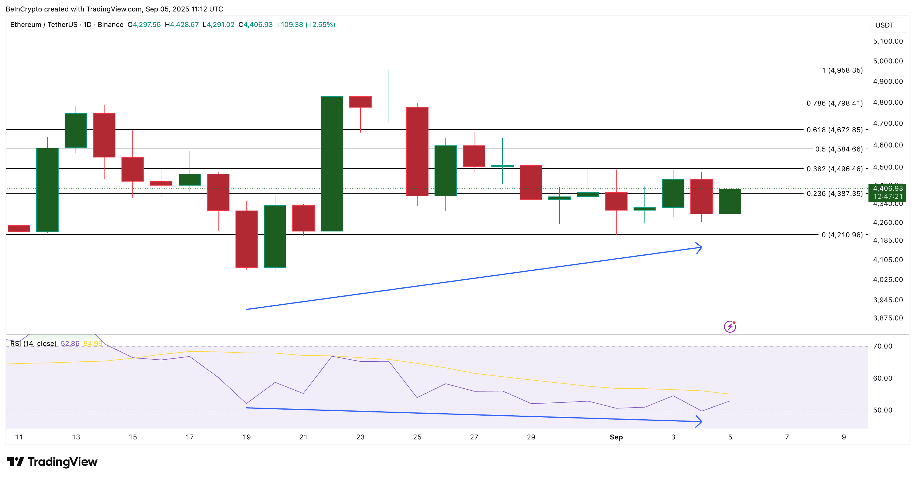 Тарихи максимумға бағытталған бұқа көңіл-күйінің үшінші себебі графиктерден шығады. Ethereum-ның күнделікті баға графигі жасырын бұқа дивергенциясын көрсетеді. ETH жоғары төменді жасаған кезде, сатып алу және сату импульсін өлшейтін Салыстырмалы күш индексі (RSI) төмен төменді жасады.