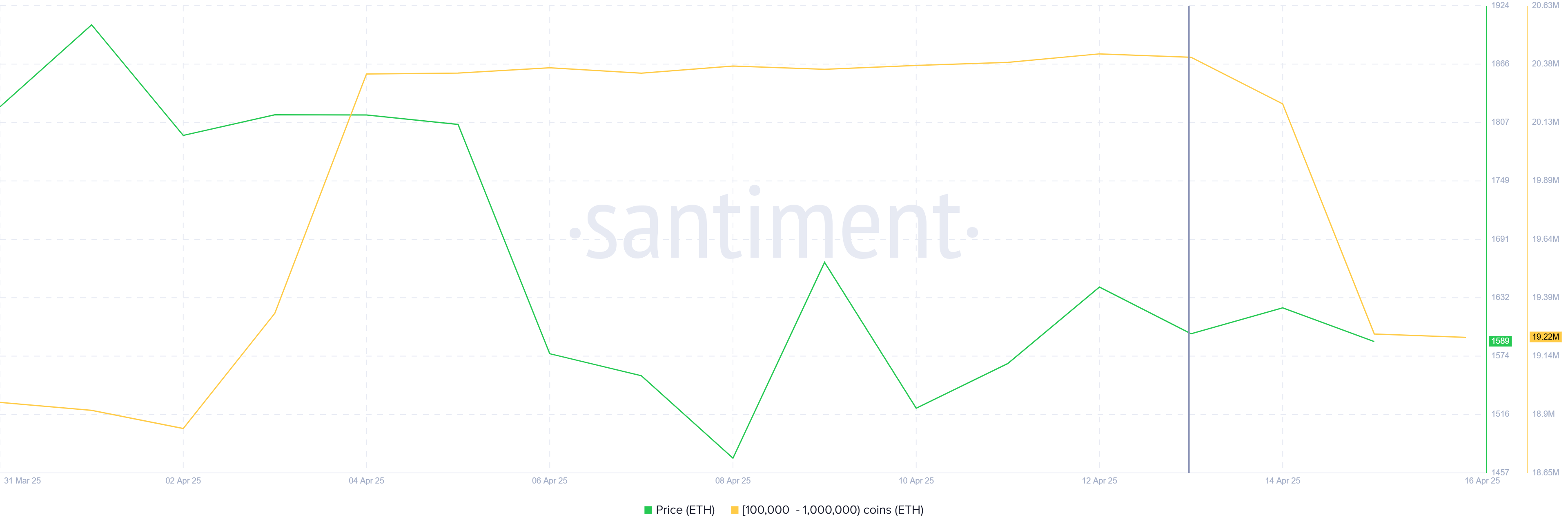 Соңғы үш күнде 100 000-нан 1 млн ETH-қа дейінгі көлемдегі мекенжайлар шамамен 1,19 млн ETH-ты, 1,8 млрд доллардан астам сомаға агрессивті түрде сатты. Бұл киттердің Ethereum-ды айтарлықтай мөлшерде сатуы нарықтағы көңіл-күйдің өзгергенін көрсетеді, өйткені олар тоқтап қалған қалпына келтіруден ықтимал шығындарды өтеуге тырысатын секілді.