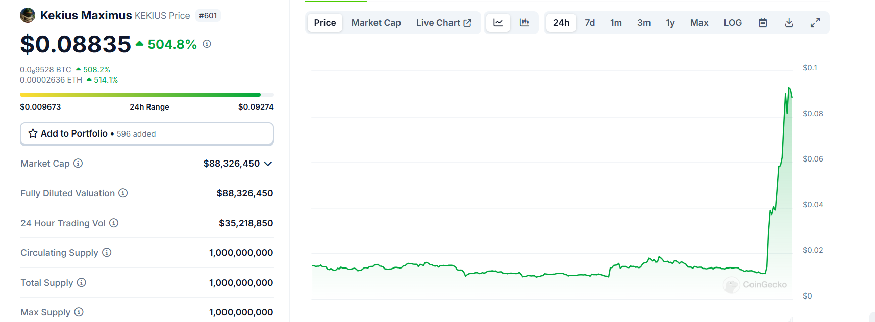 KEKIUS басылым уақытында $0.08832 бағасымен саудаланып, күнделікті диаграммада 504% өсті.