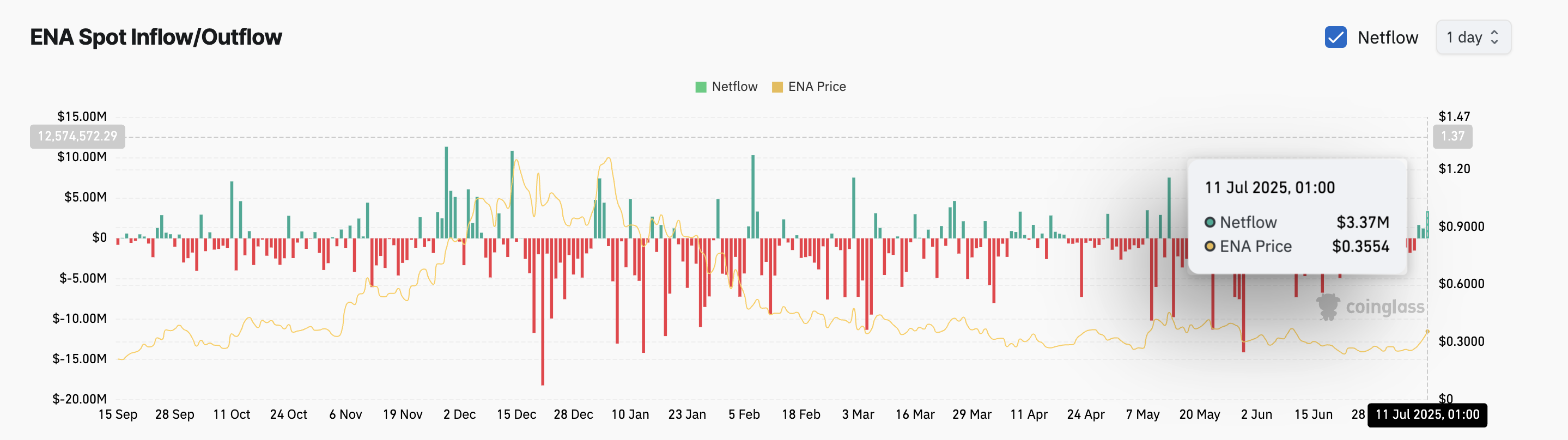 Coinglass деректеріне сәйкес, жұма күні ENA спот нарықтарына таза кіріс 3,37 млн долларға жетіп, токеннің 12 мамырдан бергі ең жоғары бір күндік кірісін белгіледі. Бұл инвесторлардың сұранысының күрт өсуін және ENA-ның қысқа мерзімді перспективаларына деген сенімнің артуын көрсетеді.