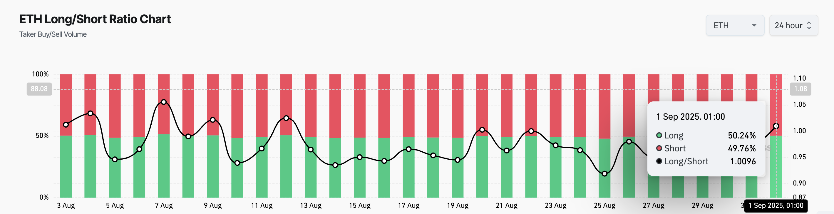 Ұзақ/қысқа қатынасы активтің бағасының өсуіне (ұзақ) немесе төмендеуіне (қысқа) бәс тігетін трейдерлердің үлесін өлшейді. Қатынас 1-ден жоғары болса, ұзақ позициялар қысқалардан көп екенін көрсетеді, бұл күшті бұқа көңіл-күйін білдіреді, ал 1-ден төмен қатынас аюлардың басымдылығын көрсетеді.