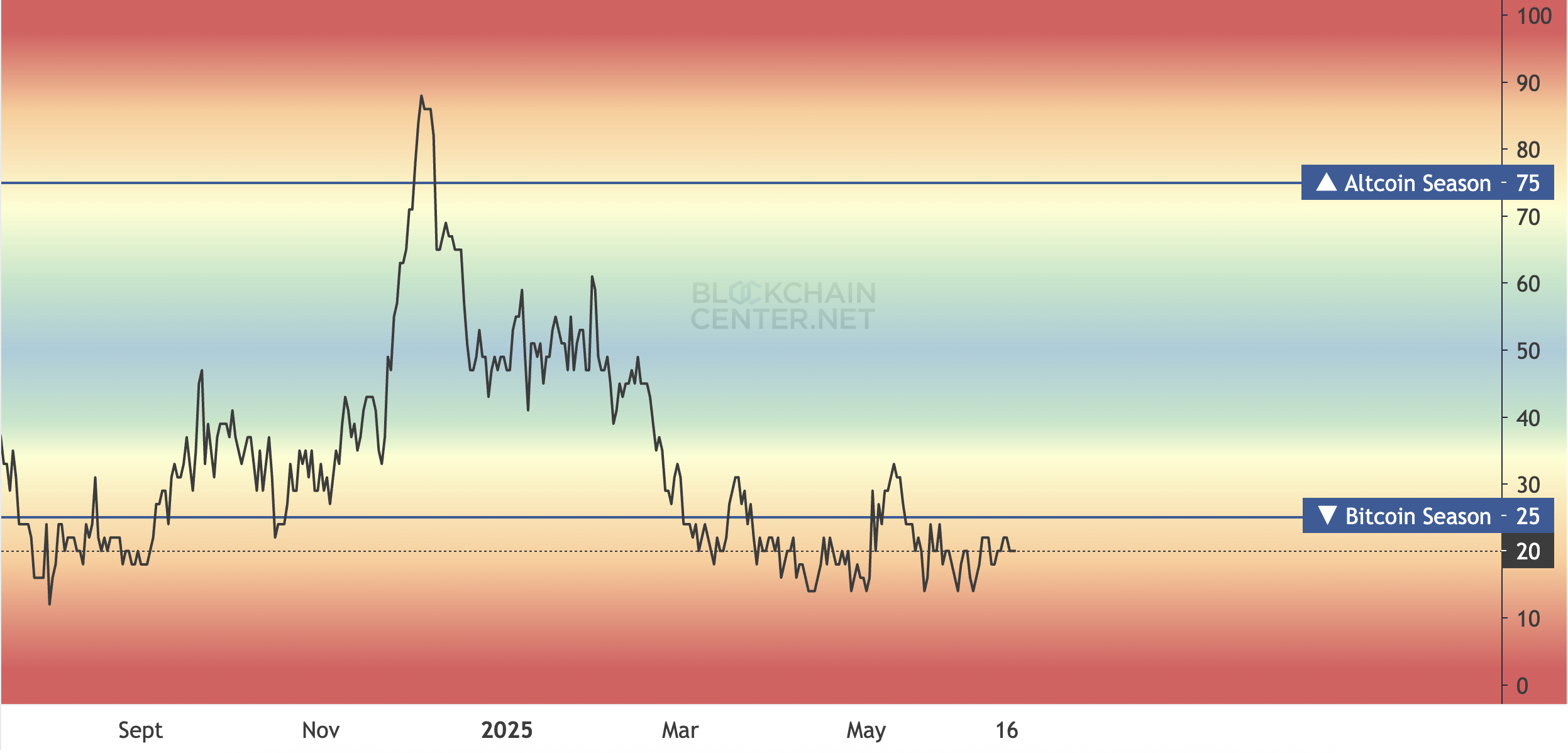 Сонымен қатар, Альткоин маусымы индексінен алынған мәліметтер нарықтың әлі де BTC-ге басымдық беретін кезеңде екенін көрсетеді. Альткоин маусымы, егер алғашқы 50 альткоинның кемінде 75%-ы үш айлық кезеңде BTC-ден асып түссе, басталады.