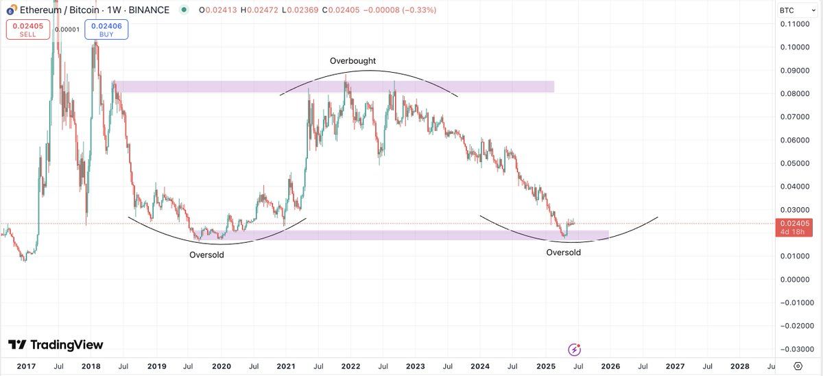 Графиктен алынған мәліметтер жұптың 0,024 деңгейінде тұрғанын көрсетеді, мұнда алдыңғы циклдің түптері қалыптасқан. 2019 және 2020 жылдардағы ұқсас құрылымдар ETH-тің ұзақ уақыт бойы нашар өнімділіктен кейін BTC-ге қатысты күшті қалпына келуін көрді. Алайда, Crypto Fella атап өткендей, “үлкен кері бұрылуды көрмес бұрын, бізге біраз күш көру керек”.