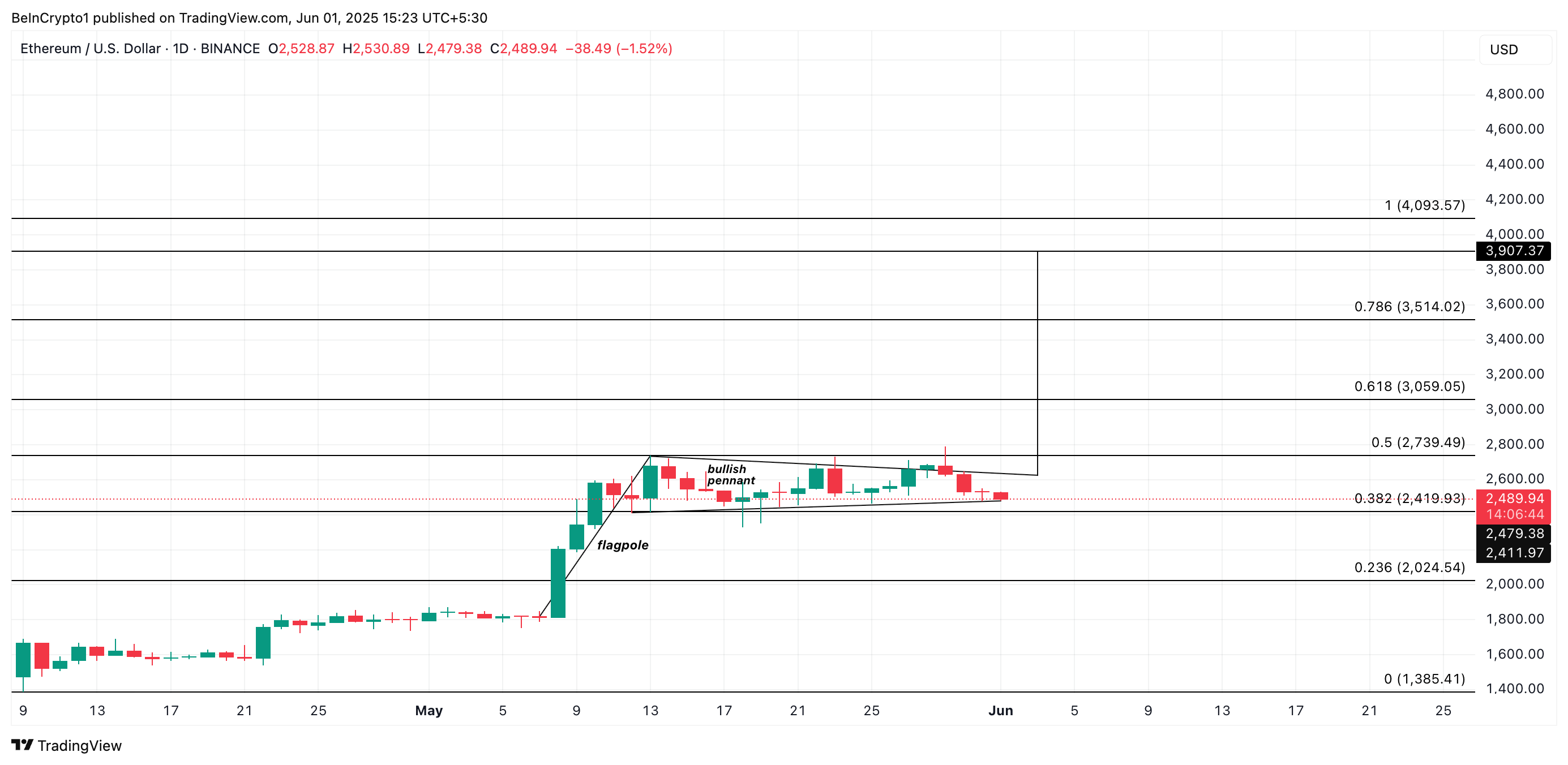 Күнделікті графиктен алынған мәліметтерге сәйкес, ETH 8 мамыр мен 13 мамыр аралығында 49%-ға өсті, содан кейін қазір бұқа пеннант үлгісін қалыптастырған консолидация кезеңіне өтті.