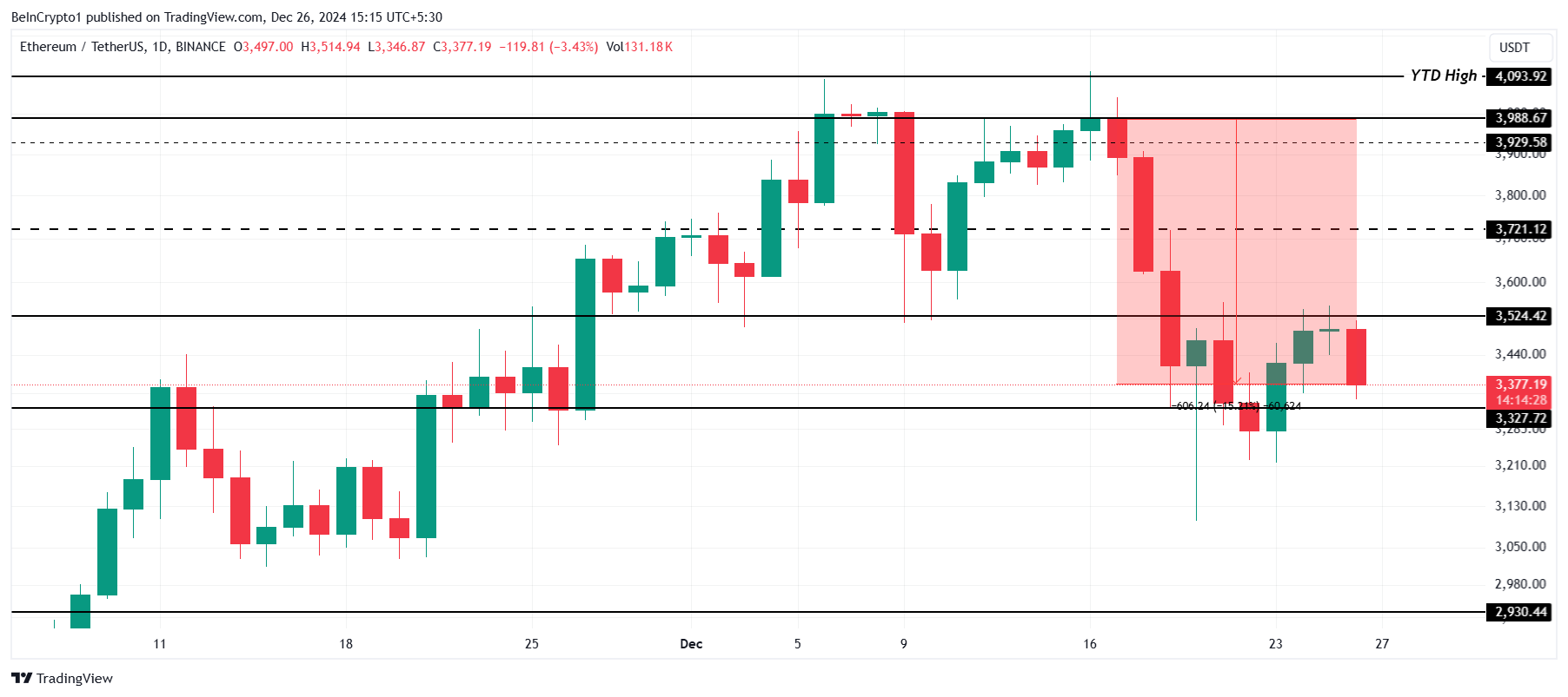 Ethereum бағасы 15% апталық төмендеуден кейін $3,377-ға дейін төмендеді. Бұл ай ішінде екінші рет ETH $4,000 қолдау деңгейін орната алмады, бұл аюлы көңіл-күйді күшейтеді. Бұл маңызды деңгейді ұстай алмау Ethereum-ды одан әрі түзетулерге осал етеді.