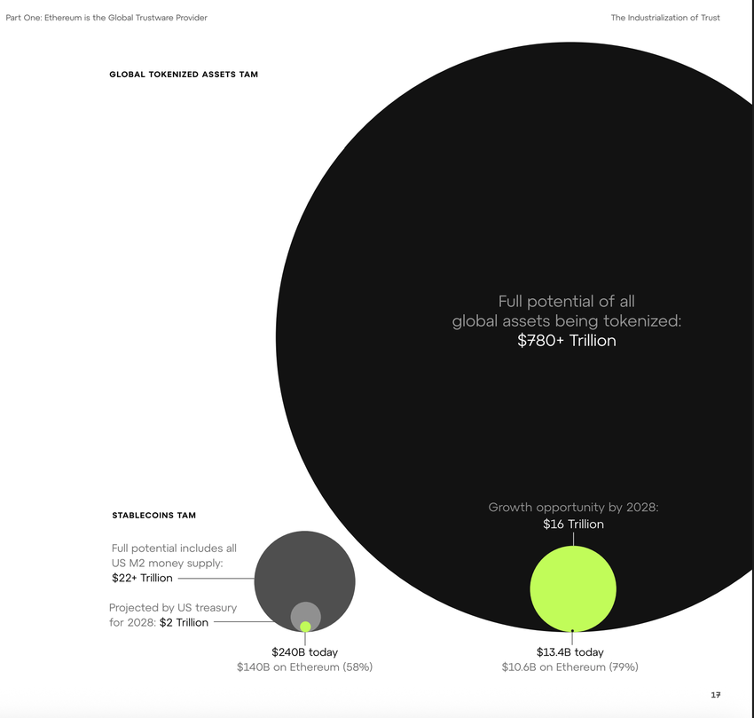 Ол тезисті макро бөлініс ретінде қорытындылады: Ethereum сауда емес, тұрақты монеталар мен токенделген капитал нарықтары үшін бағдарламаланатын инфрақұрылым.